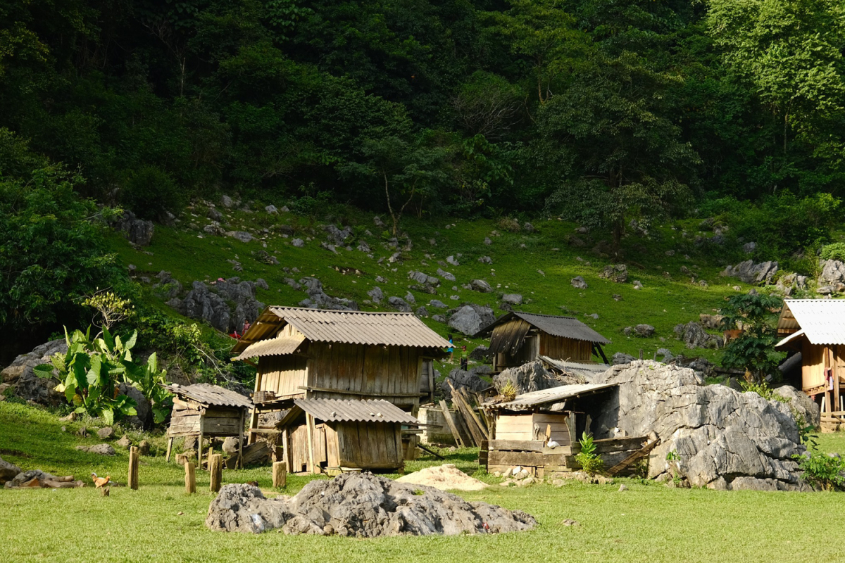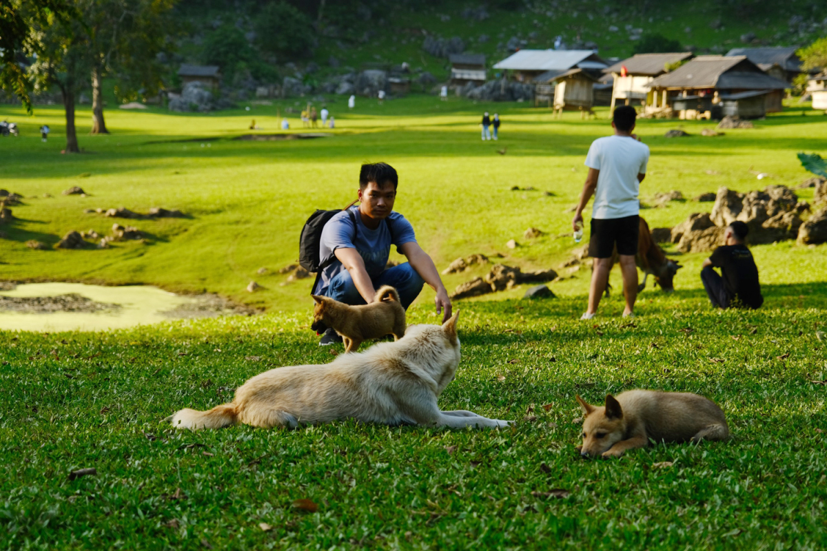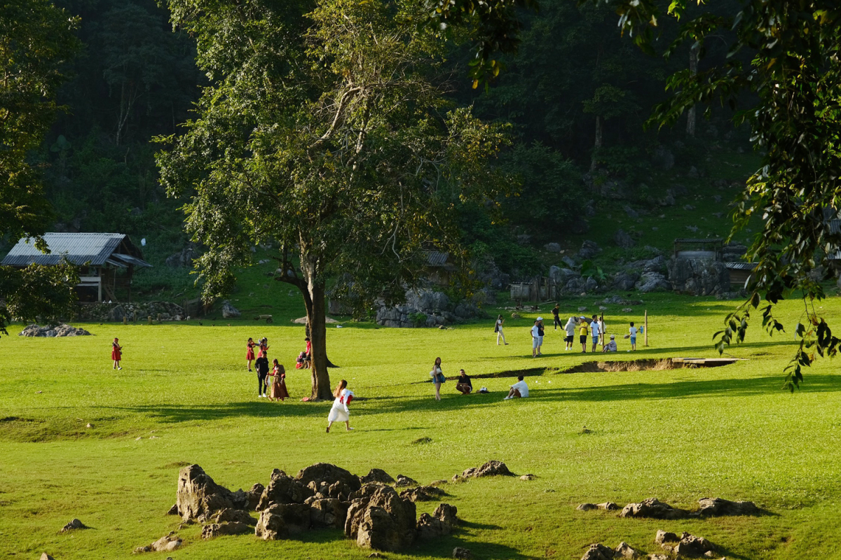 Khung cảnh một chiều thứ 7 ở Hang Táu, trên những bãi cỏ trống sau nhà gỗ.