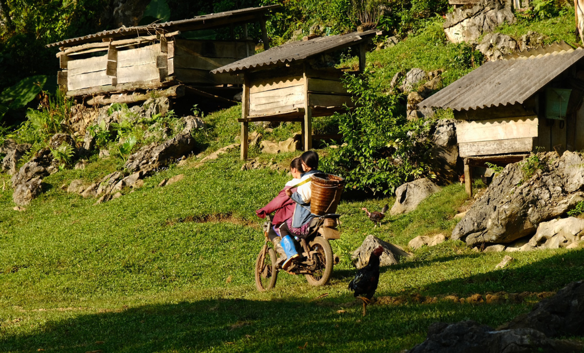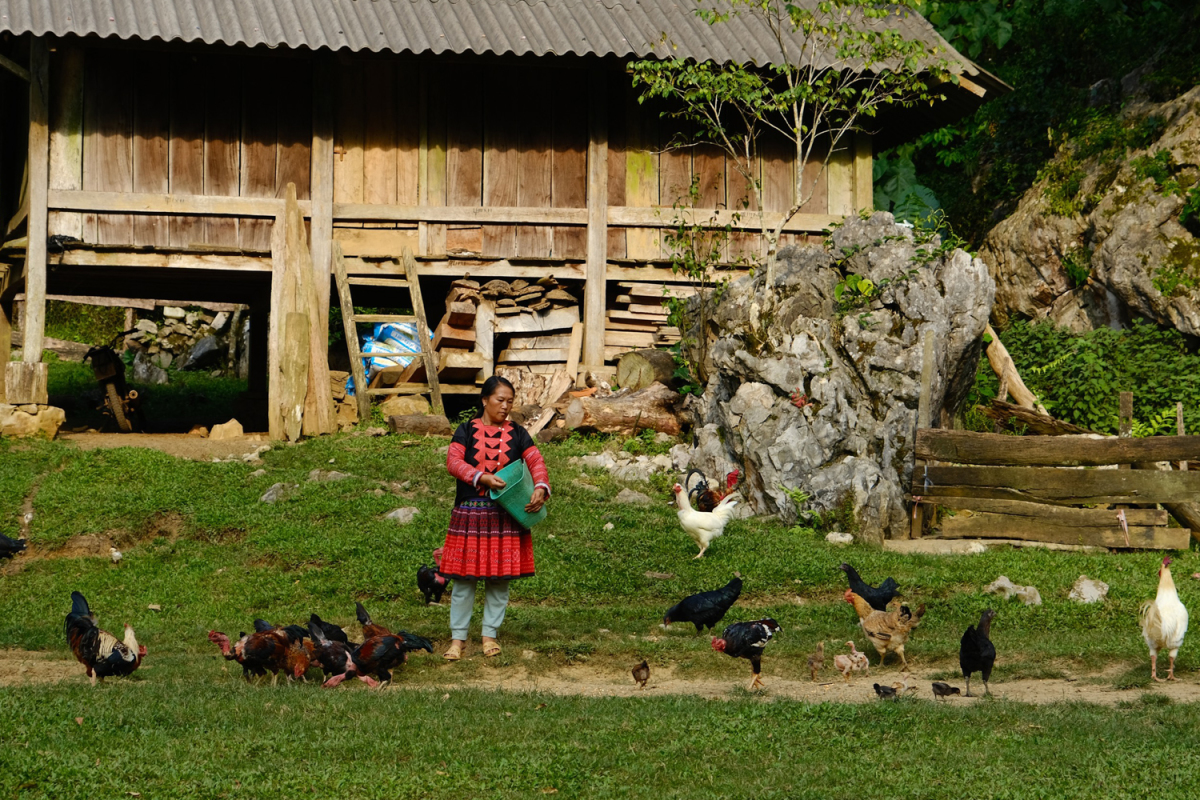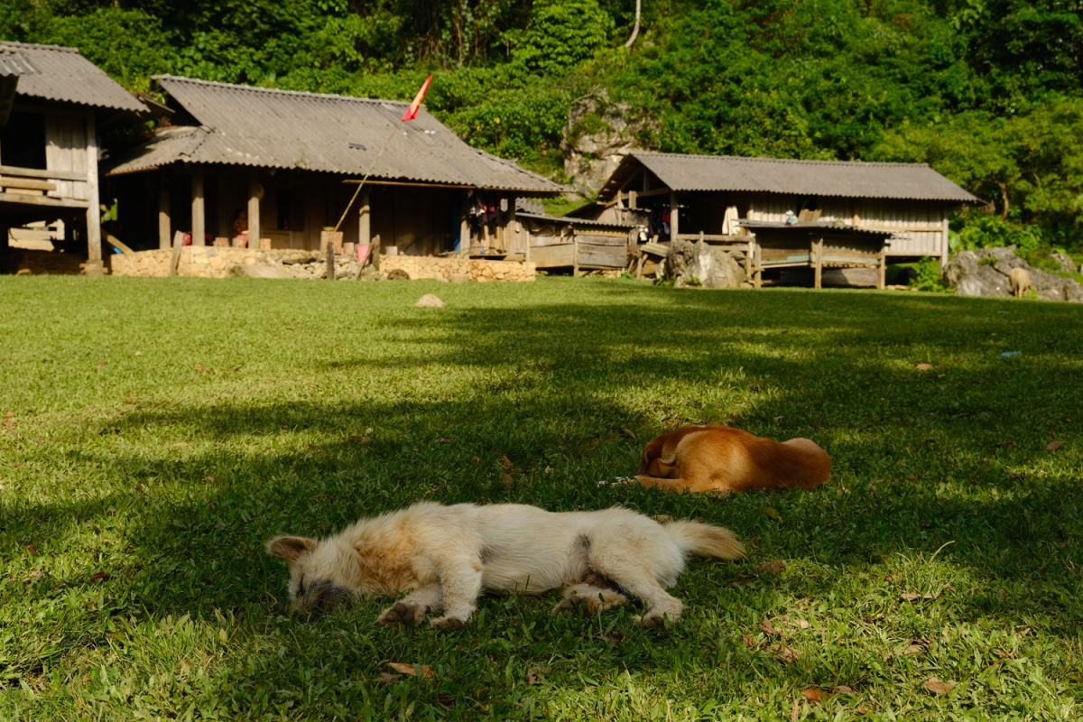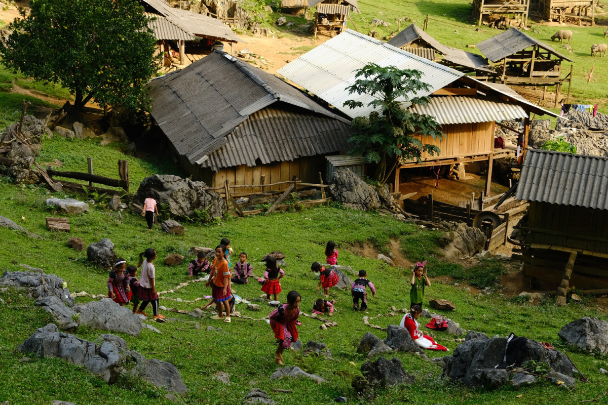 Khung cảnh một chiều thứ 7 ở Hang Táu, trên những bãi cỏ trống sau nhà gỗ.