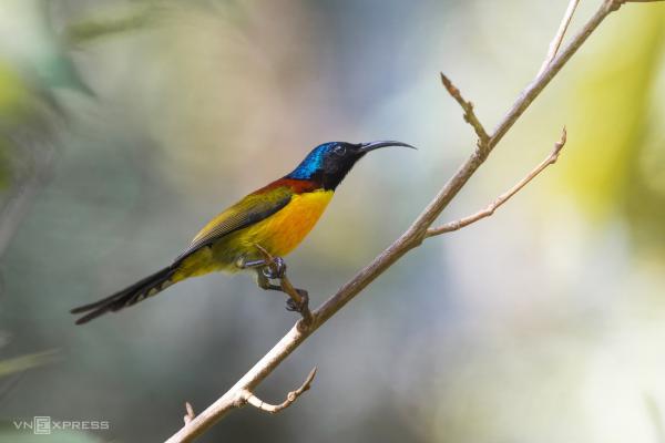 Hút mật Nepal là loài chim hút mật có màu sặc sỡ với phần đầu và đuôi màu xanh lục nhạt, phần lưng trên màu đỏ đậm và phần dưới màu vàng tươi. Ảnh: Lê Khắc Quyền