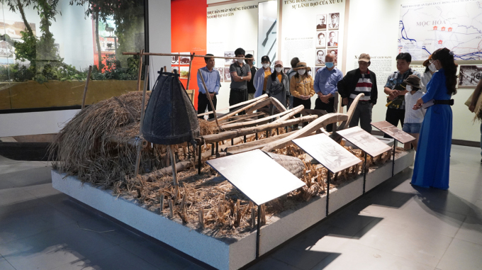 Đoàn khách tìm hiểu các vật dụng quen thuộc của nông dân Đồng Tháp Mười hàng trăm năm trước như xuồng gặt lúa ma, phản phát cỏ. Ảnh: Hoàng NamTừ Gò Tháp, ngược sông hơn 1 km bằng trẹt gỗ, loại phương tiện thông dụng ở Đồng Tháp Mười, bạn sẽ đến khu vực cánh đồng sen. Bên trong căn chòi dựng bằng cây, lá, hãy thưởng thức các món đặc sản Đồng Tháp Mười như ốc bươu nướng tiêu, cá lóc nướng quấn lá sen non chấm mắm me, cơm hấp lá sen...