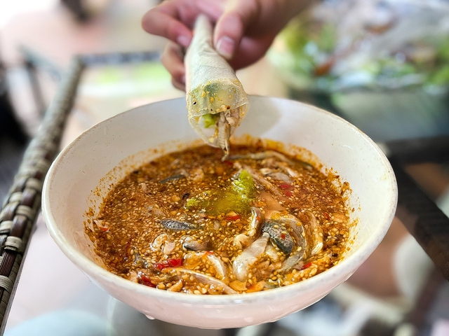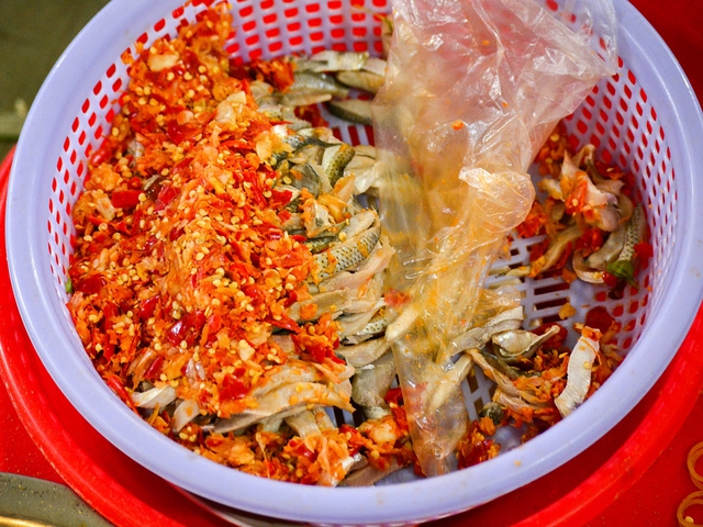 Món cá ướt có thể thêm bánh tráng nướng bẻ nhỏ và cho vào ăn chung (ảnh: HỮU TÚ).Trung bình, mỗi ngày bà Hoa bán được 6 kg cá, thứ bảy tăng lên 8 kg còn chủ nhật có ngày lên khoảng 12 kg cá.