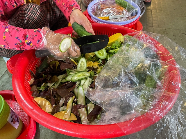 Các loại rau được bà Hoa chuẩn bị từ sáng sớm và được đậy kỹ nên giữ được độ tươi mát (ảnh: HỮU TÚ).Gỏi cá ăn kèm với các loại rau, quả như xà lách, giá đỗ, xoài, dưa chuột và một số loại rau rừng khác. Bà Hoa thường thêm nhiều rau cho khách hàng vì món gỏi cá phải ăn với nhiều rau mới ngon...