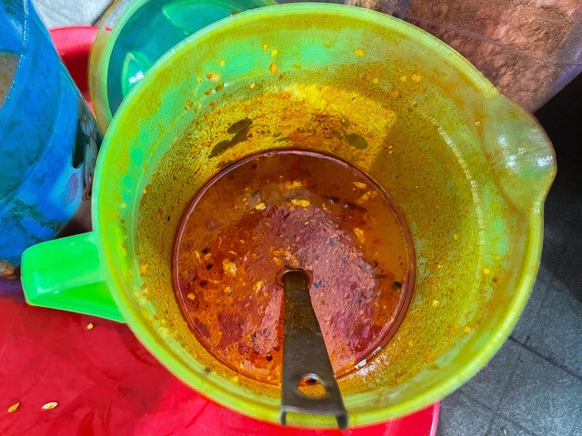 Bà Hoa bật mí, nếu muốn nước chấm được ngon hơn thì nên cho nhiều đường phèn (ảnh: HỮU TÚ).Đặc biệt, hai loại gỏi cá không chỉ khác nhau ở cách chế biến mà còn khác nhau về nước chấm. Mỗi loại nước chấm đều được pha chế theo cách riêng, được xem là "công thức bí mật" của những người bán gỏi cá Nam Ô.