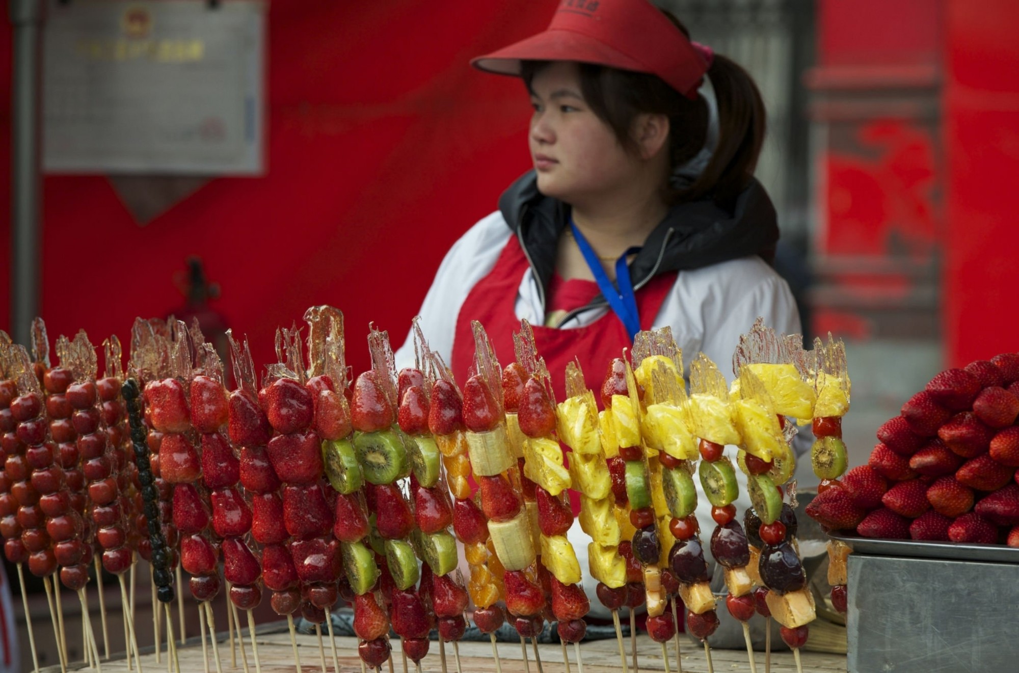 Chắc hẳn bạn cũng đã từng nhìn thấy những que kẹo tròn xoe xếp tầng vào nhau với sắc đỏ đặc trưng trong những bộ phim cổ trang Trung Quốc. Đó là hồ lô đường và kẹo đường, những món ăn đường phố bình dân có lịch sử hàng nghìn năm. Hồ lô đường ngày nay đã trở thành một phần không thể thiếu của những khu chợ đường phố Trung Quốc. Món ngon này vốn chỉ là táo bọc đường, sau đó được sáng tạo thêm nhiều hương vị như kiwi, anh đào, nho, dâu tây… với giá khoảng 10-15 RMB cho một xiên.