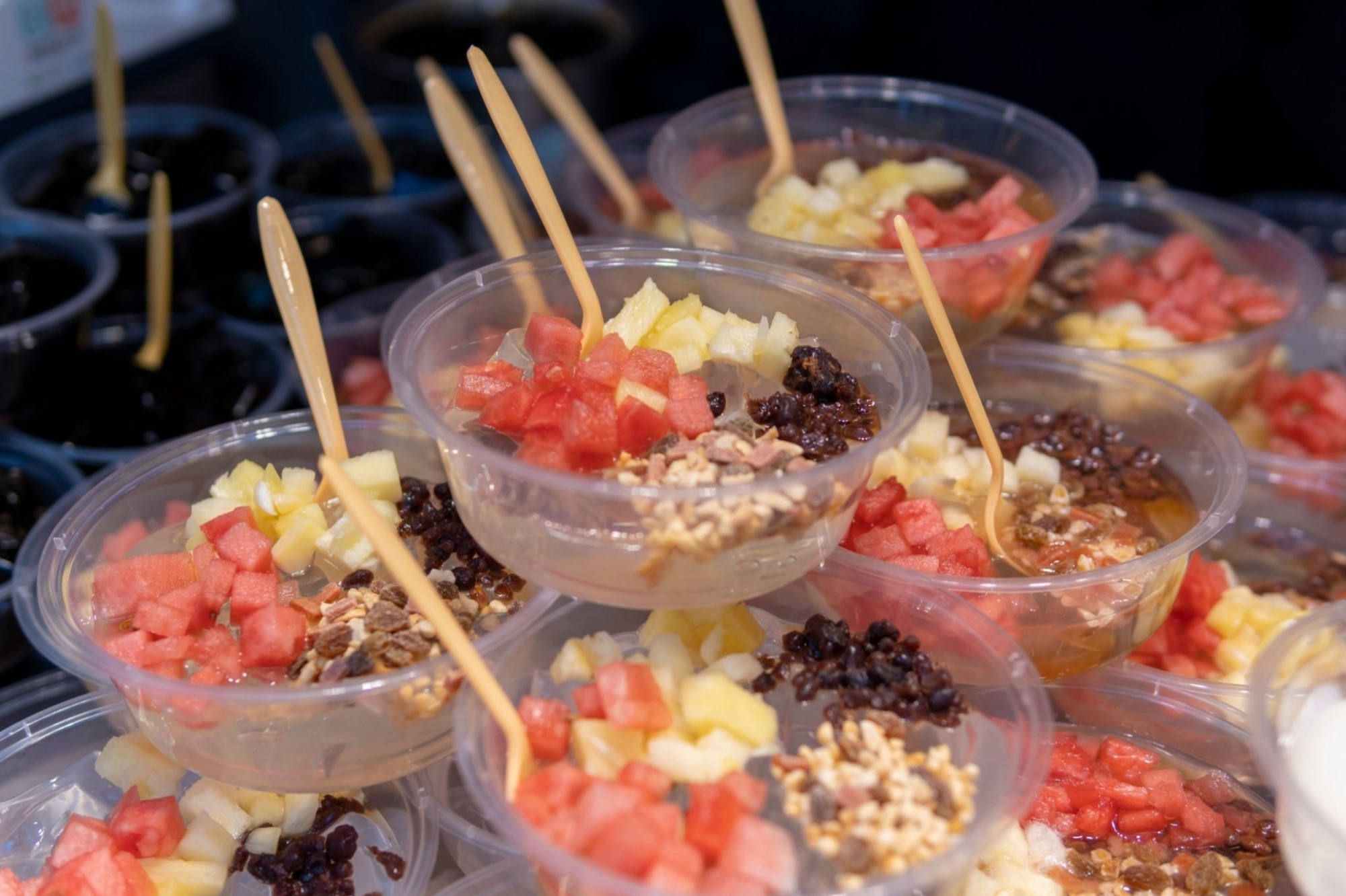 Ở nhiều góc phố, du khách sẽ bắt gặp các quầy hoa quả dầm, hoa quả trộn bán theo cân với giá từ là 9,9 RMB cho 250gr (130.000 đồng một kg). Tùy theo sở thích, du khách có thể chọn giữa hàng chục loại quả như dâu tây, nho, kiwi, táo, dưa, xoài… sau đó thêm các topping trân châu, thạch, hạt... Những nguyên liệu sẽ được cắt nhỏ, trộn sữa chua là có thể ăn được ngay. Một hộp hoa quả trộn thường có giá 100.000 đồng dành cho 2 - 3 người ăn.