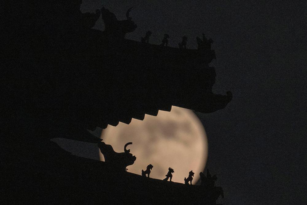Mặt Trăng đạt cực đại vào hôm 14/6. Hiện tượng này còn được gọi là "siêu trăng dâu tây (Strawberry Moon)" vì Mặt Trăng tròn vào thời điểm thu hoạch dâu tây ở Mỹ. Trong ảnh, những vật trang trí hình những con thú linh thiêng trên mái của Tử Cấm Thành ở Bắc Kinh (Trung Quốc) được in bóng dưới ánh trăng hôm 14/6.