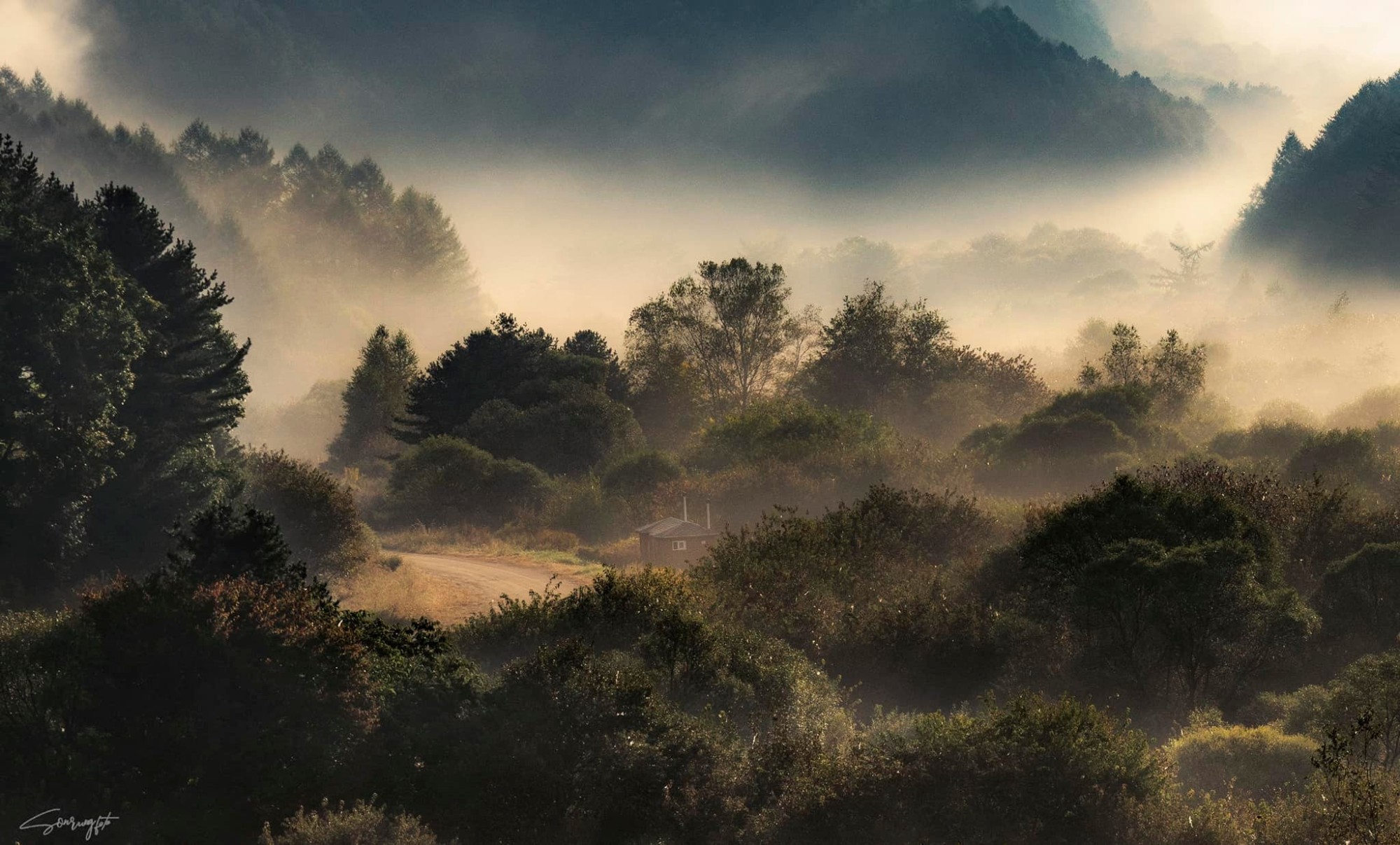 Bức hình tại Gapdun-ri cũng là bức ảnh kì công của Quang Sơn. Đây là lần đầu tiên anh lái xe một mình hơn 200km để tới khu vườn bí mật này và kịp chiêm ngưỡng khoảnh khắc sương giăng lúc bình minh