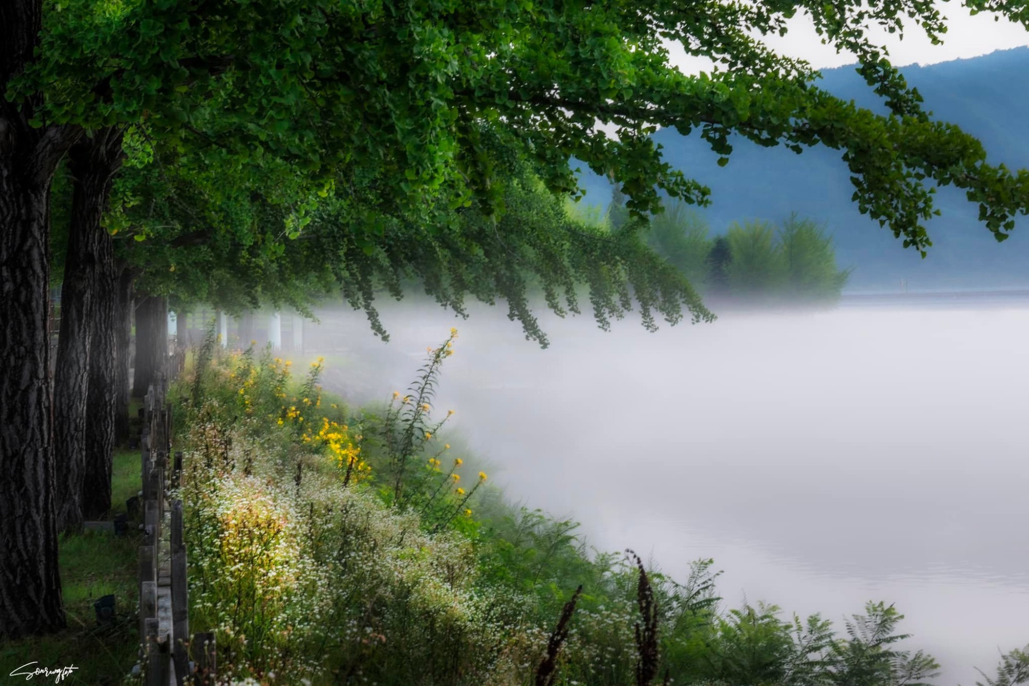 Đây là bức ảnh ở Daily Leisure Town thuộc Songgwang-myeon, Suncheon-si. Nơi này nằm ở vùng núi sâu nằm quanh hồ Juam, có cảnh quan đẹp như tranh vẽ với những cây cầu gỗ bập bềnh, cây cổ thụ in bóng mặt hồ… Sáng sớm, sương bao phủ mặt hồ tạo cảnh mờ ảo. Đàu tháng 8 hàng năm, hoa tường vi ở đây bung nở khiến không gian càng thêm ấn tượng