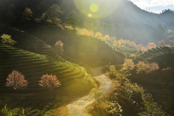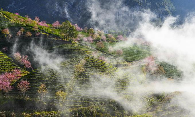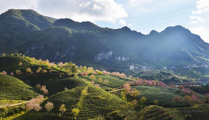 Những tia nắng đầu tiên của ngày mới chiếu lên vườn chè cũng là lúc màu sắc của những cánh hoa mai anh đào trông rực rỡ nhất.
