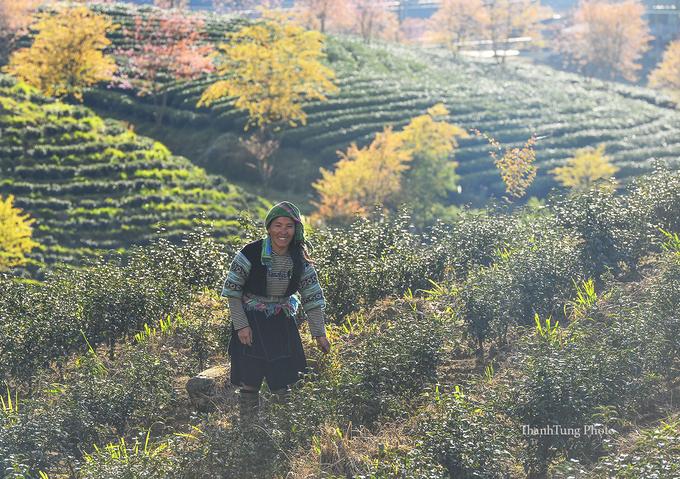 Cách trung tâm Sa Pa khoảng 7 km, một đồi chè với những cây hoa mai anh đào tô điểm trong sương thu hút nhiều tay săn ảnh.