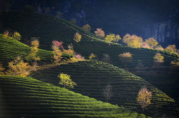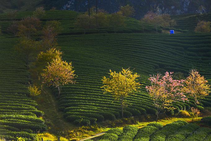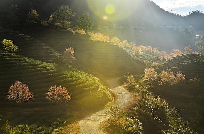 Buổi chiều, đồi chè với những cây hoa mai anh đào hiện lên vẻ đẹp huyền ảo khi những tia nắng chiếu vào.