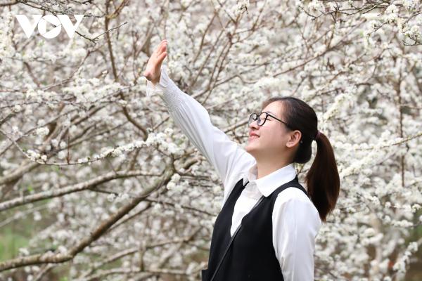 Cây mận ở Sơn La có dáng thấp, cành xòe ngang tầm người, nên du khách có thể dễ dàng lưu lại những bức ảnh đẹp cùng hoa mận.