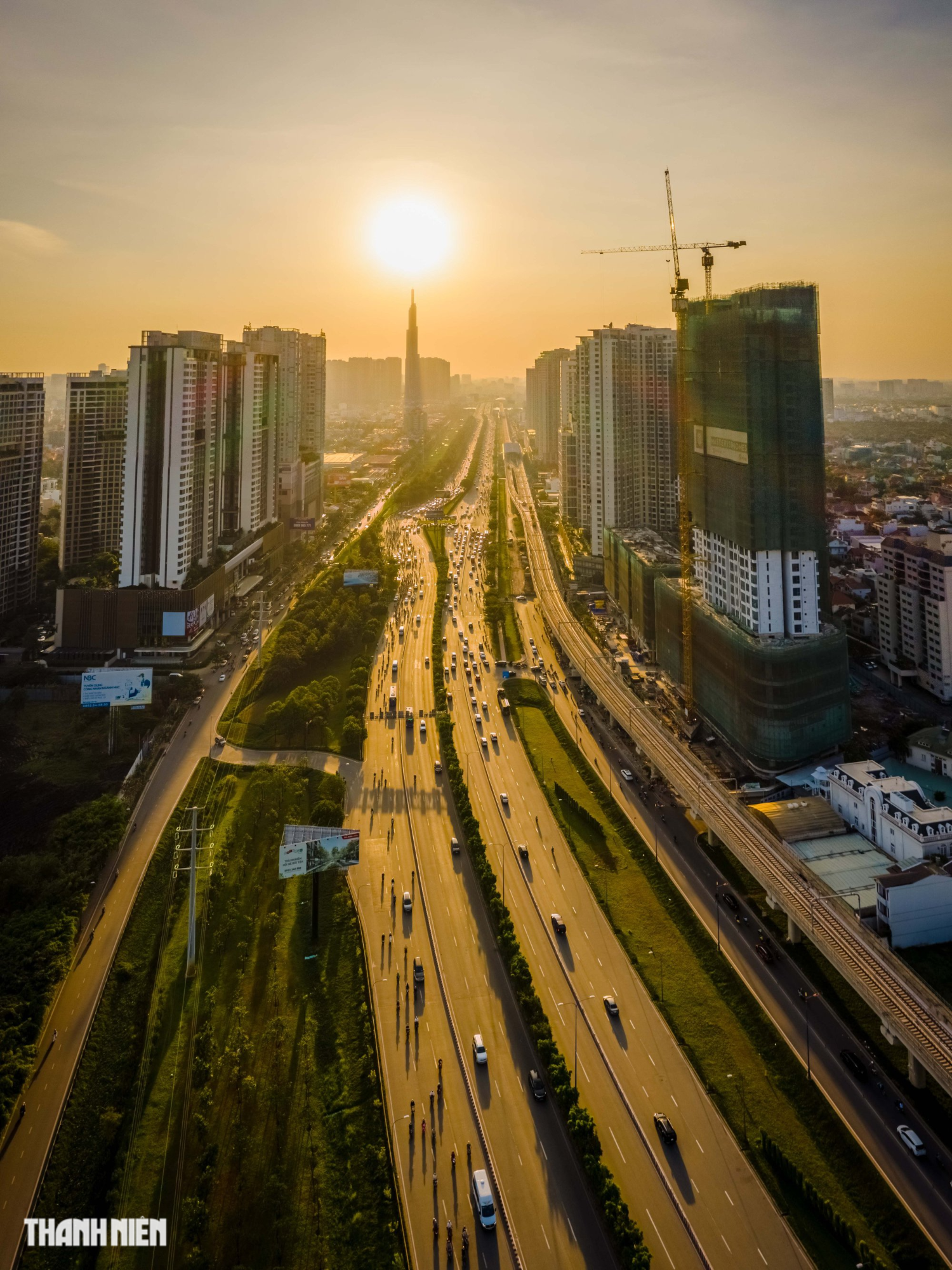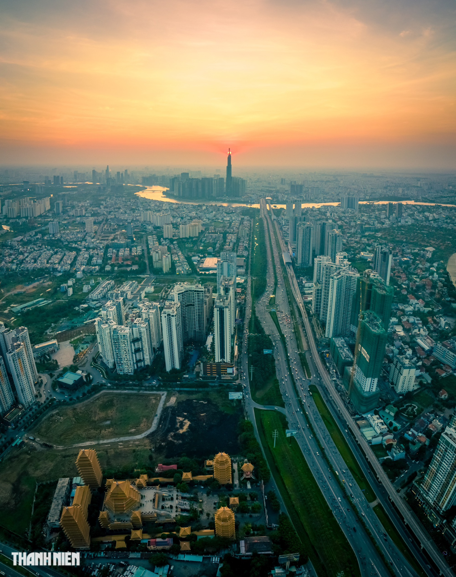 Landmark 81, biểu tượng của phát triển, tòa nhà cao nhất Việt Nam ở phía xa. Còn con đường chạy dài bên cạnh Xa lộ Hà Nội chính là tuyến metro số 1 Bến Thành - Suối Tiên sắp vận hành thương mại, kết nối du khách với các điểm đến từ trung tâm ra ngoại thành (ảnh: BÙI VĂN HẢI)
