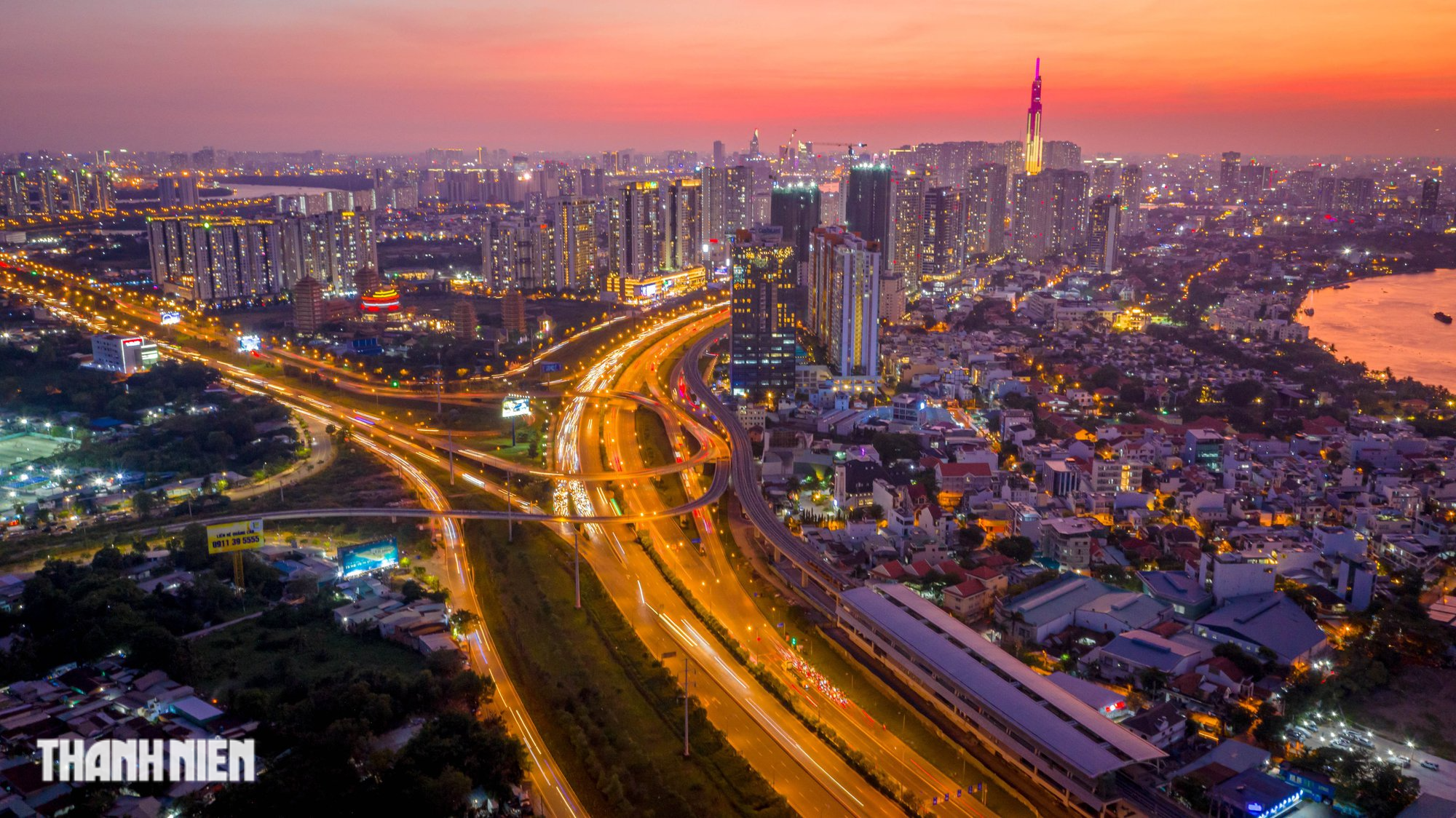 Hoàng hôn tắt nắng, màn đêm chực chờ buông xuống cũng là lúc TP.HCM mang một màu sắc khác. Cách cầu Sài Gòn khoảng 2,5 km là nút giao thông ngã ba Cát Lái, đoạn giao thông giữa hai trục đường Xa lộ Hà Nội và Mai Chí Thọ trong buổi đầu đêm rực rỡ ánh đèn. Đây là cửa ngõ vào trung tâm thành phố, cũng là tuyến đường kết nối giữa thành phố với các tỉnh Đông Nam bộ, xa hơn là về Trung, về Bắc (ảnh: BÙI VĂN HẢI)