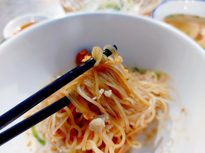 Sợi hủ tiếu Mỹ Tho nhỏ, dai và giòn, được làm từ gạo Gò Cát, xã Mỹ Phong. Ảnh: Khánh Thiện Khi thực khách gọi món, người bán sẽ chần sợi hủ tiếu qua nước sôi vài phút. Nếu để lâu quá, sợi hủ tiếu sẽ bị bở hoặc mềm, không ngon. Sau đó, người bán sẽ cho hủ tiếu vào tô, thêm ít tóp mỡ, hành phi, nước tương và trộn đều. Cách này giúp sợi hủ tiếu trong, bóng và bắt mắt.