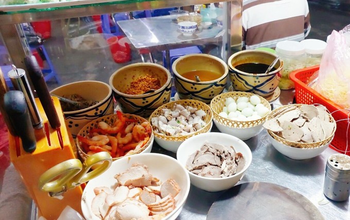 Các "topping" không thể thiếu trong tô hủ tiếu Mỹ Tho gồm phèo, gan, tim, thịt lát, tôm, trứng cút... Ảnh: Khánh Thiện Hiện nay, món hủ tiếu Mỹ Tho đã trở nên thân thuộc và gần gũi với nhiều người. Tại TP HCM, nếu thích món ăn này, thực khách có thể ghé những tiệm trên đường Cách Mạng Tháng Tám (quận Tân Bình), Hùng Vương (quận 5), Lê Văn Thọ (quận Gò Vấp), Hoa Mai (quận Phú Nhuận)... Giá một tô hủ tiếu từ 35.000 đồng.