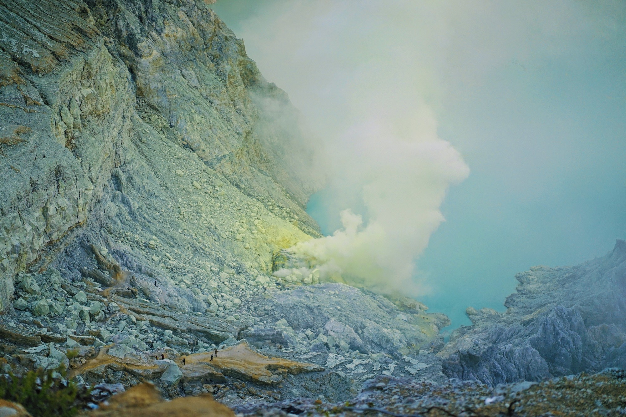 Không giống như các du khách được bảo hộ kỹ càng, những người đàn ông bản địa ngoài tứ tuần không hề mang mặt nạ hay bao tay. Ngày nào cũng vậy, họ nhặt đá lưu huỳnh, đập nhỏ đẽo gọt thành nhiều mặt hàng lưu niệm với giá 30.000 Rupiah (tầm 47.000 đồng) một sản phẩm. Công việc khác nữa là giúp khách di chuyển lên miệng núi lửa bằng các "taxi kéo" với mức giá 800.000 Rupiah (tầm 1,2 triệu đồng) một lượt. Do đó, các du khách không đảm bảo yêu cầu thể lực vẫn có cơ hội chiêm ngưỡng hồ axit có một không hai này. Dẫu biết có thể đánh đổi bằng tuổi thọ, nhưng những người này không có sự lựa chọn nào khác vì phải mưu sinh. Chặng hành trình của cô kết thúc lúc 9h sáng ngày hôm sau.