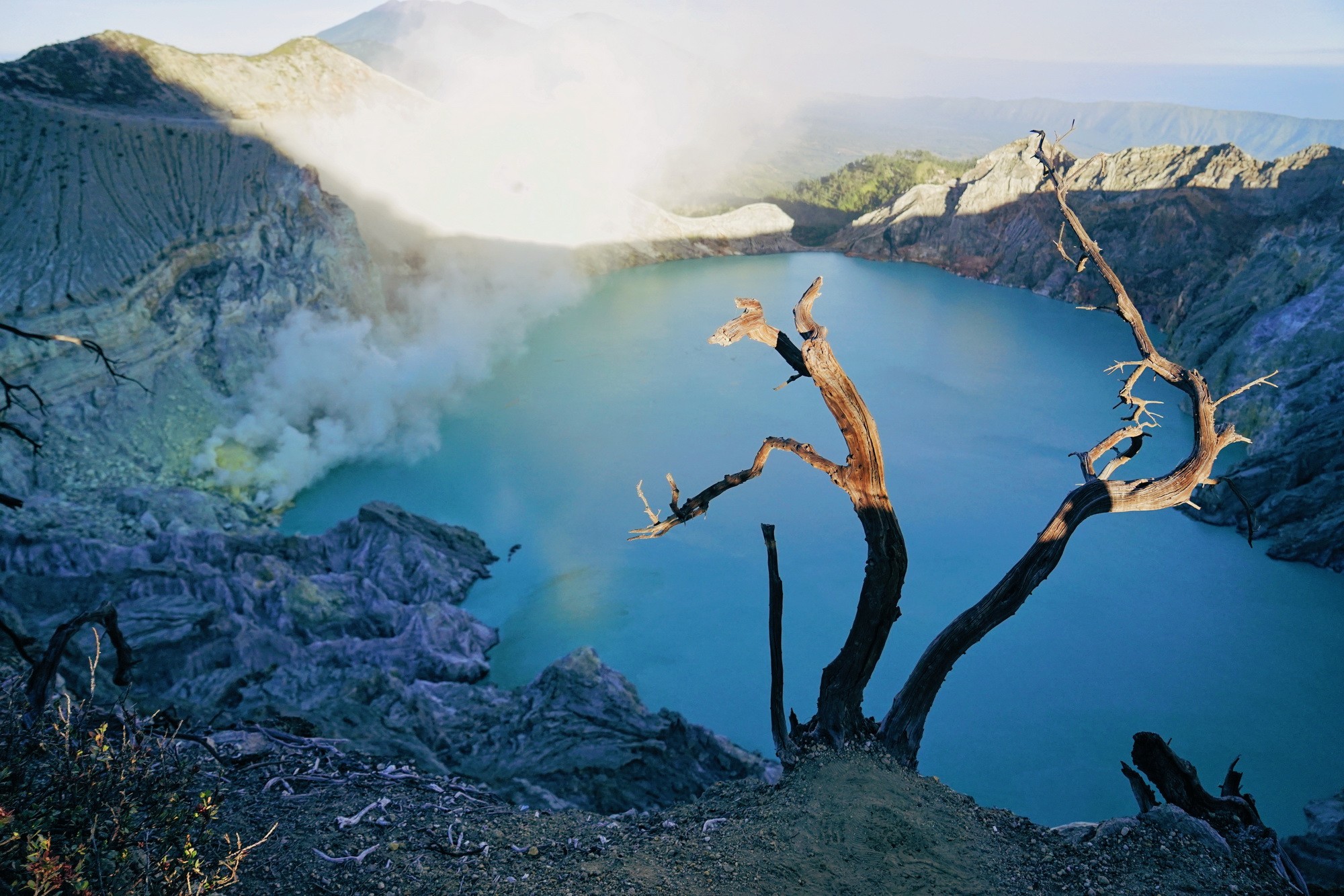 Trời gần sáng, ngọn lửa cũng yếu dần rồi tắt đi. Lúc này mình cần phải trèo lên cho kịp thấy bình mình. Tối và sáng ở đây như hai thế giới khác biệt như địa ngục và thiên đàng. Đêm tối ma mị, ẩn chứa bất an bấy nhiêu thì sáng sớm cứ như tiên cảnh. Mặt trời lên làm lộ rõ mặt hồ xanh biếc, cảnh vật quang đãng.