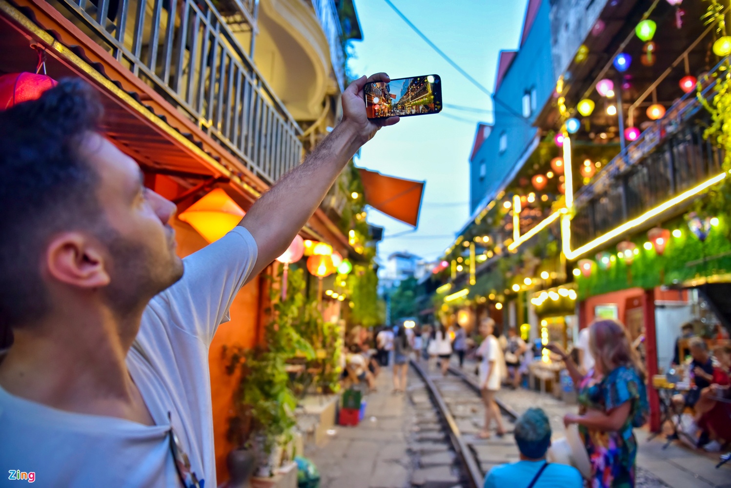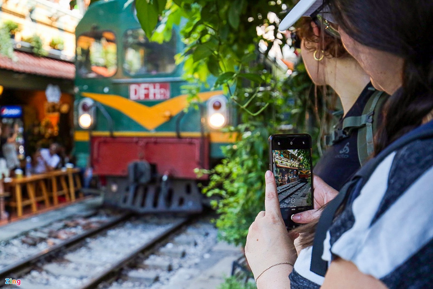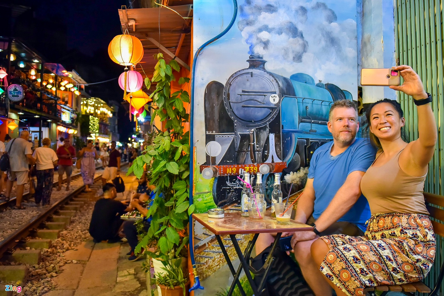 Nhiều du khách nước ngoài thích thú khi tới "phố đường tàu", vừa uống cà phê vừa trải nghiệm cảm giác mạnh mỗi khi có đoàn tàu chạy qua.