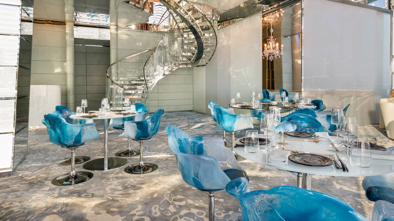 Những khối vuông dát vàng 18 carat được sử dụng để tạo họa tiết trên tường, điểm xuyết bằng chiếc đèn chùm lớn nhất thế giới với chiều cao 56 m (183 feet) lấp lánh ánh ngọc trai. Tất cả tạo thành bức tranh tổng thể vừa sang trọng vừa bóng bẩy.