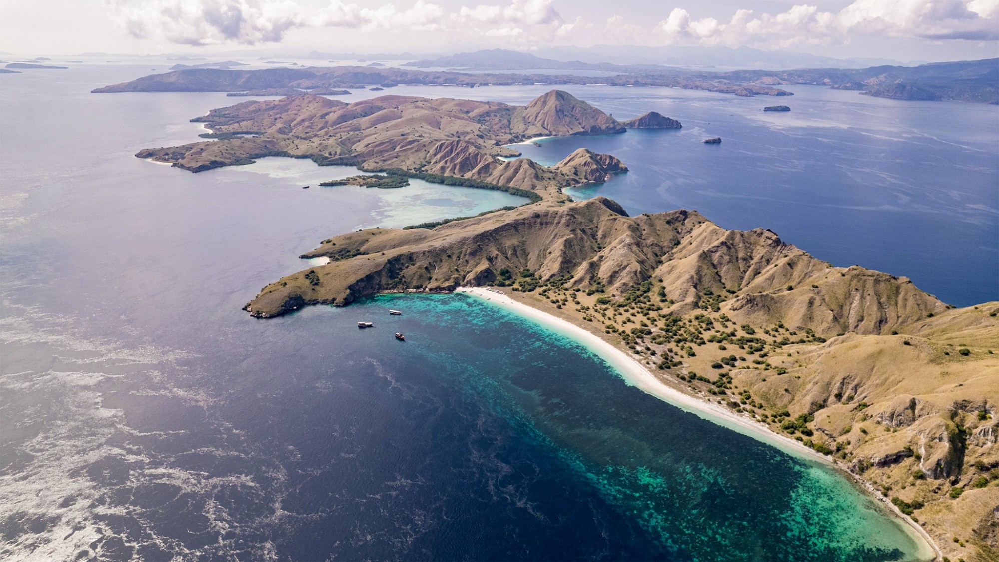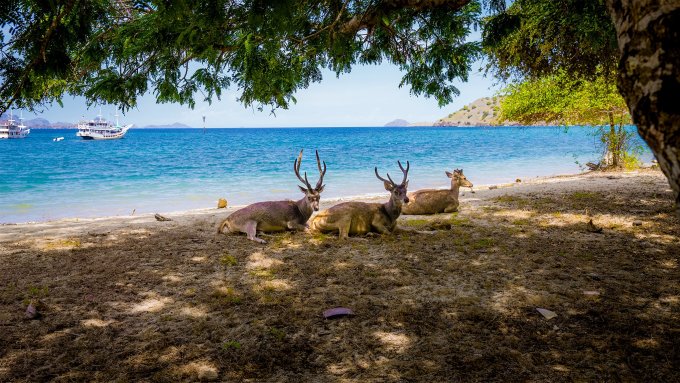 Cảnh đẹp nguyên sơ trong vườn quốc gia Komodo. Những con hươu có thể là mồi ngon của rồng Komodo. Để đến đây, bạn có thể mua tour đi tàu thủy từ Bali hoặc Lombok. Tour này khoảng 4 ngày 3 đêm, hoặc 3 ngày 2 đêm tùy loại. Tuy nhiên, hành trình này không phải ai cũng chịu được. Nhiều khách Tây nôn ói, nằm vật vã trên sàn thuyền do say sóng của hai dòng hải lưu giao giữa biển Java và Flores.