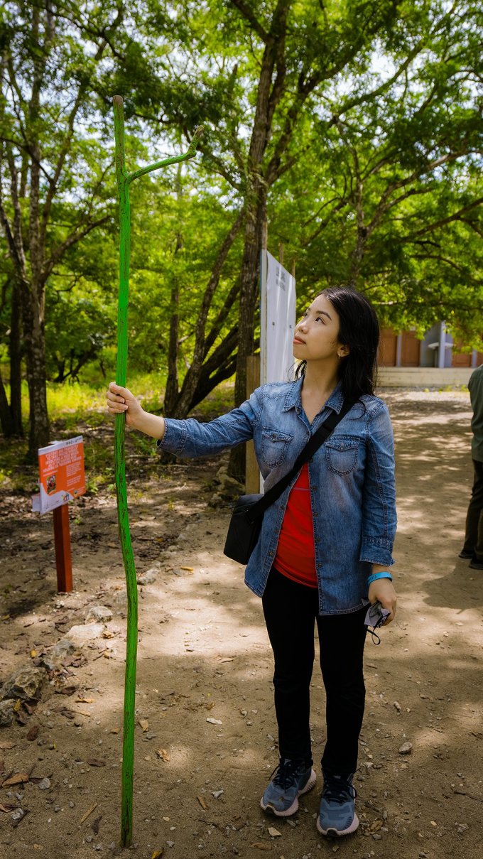 Chiếc gậy dài mà những người dẫn đường đem theo để đảm bảo an toàn cho du khách.Mỗi nhóm du khách sẽ đi cùng hai người trong khu bảo tồn với gậy dài để tự vệ. Nếu tìm thấy rồng Komodo, du khách nên giữ khoảng cách an toàn 5 m. Lang thang đi tìm chúng là cảm giác được hai vợ chồng Thái mô tả vừa háo hức lại vừa căng thẳng tột độ. Đặc tính của loài rồng Komodo là nằm giả chết như một khúc gỗ mục trong rừng, chờ con mồi đi qua là đớp nhẹ, tiêm nọc độc và vi khuẩn, ngồi chờ chúng bất động rồi "chén gọn". "Lời khuyên mà tôi nhận được là đừng bước ra khỏi làn cỏ đã được xem xét kỹ bởi người dẫn đường", Thái nhớ lại.
