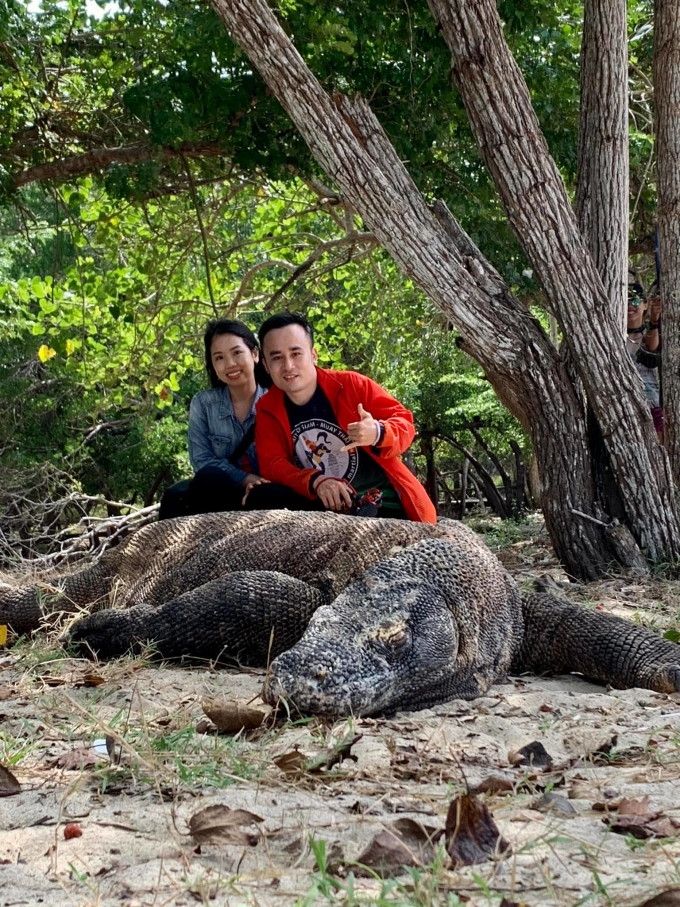 Dù có hướng dẫn viên đứng gần để đảm bảo an toàn, hai vợ chồng vẫn nín thở khi chụp cùng một con rồng Komodo đang ngủ say.Ngày bé anh Thái hay xem thế giới động vật trên truyền hình nhưng ở bên ngoài thấy loài vật này to hơn. Nếu may mắn, du khách sẽ được chứng kiến cảnh rồng Komodo bơi ra biển. Vì vậy nếu tắm biển ở đây, bạn cũng cần phải lưu ý khi có thể gặp chúng. Chúng bơi để hạ nhiệt cơ thể, bắt đầu quay về bờ khi bơi xa bờ khoảng 30 m.