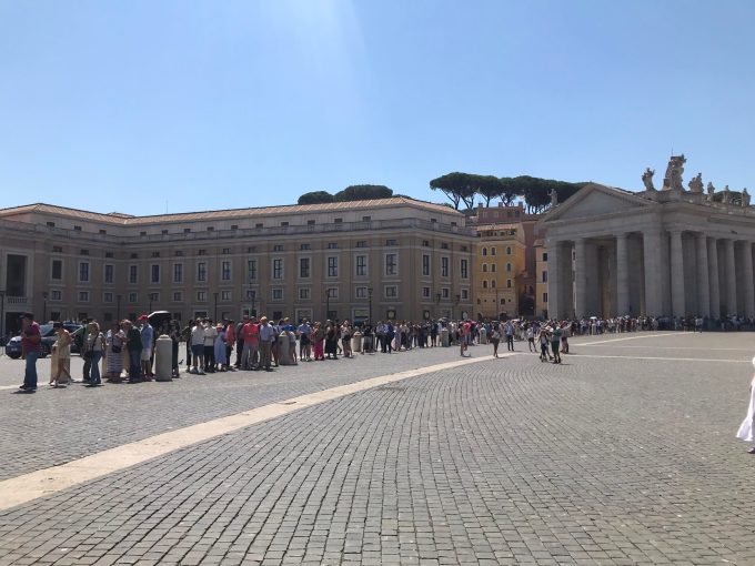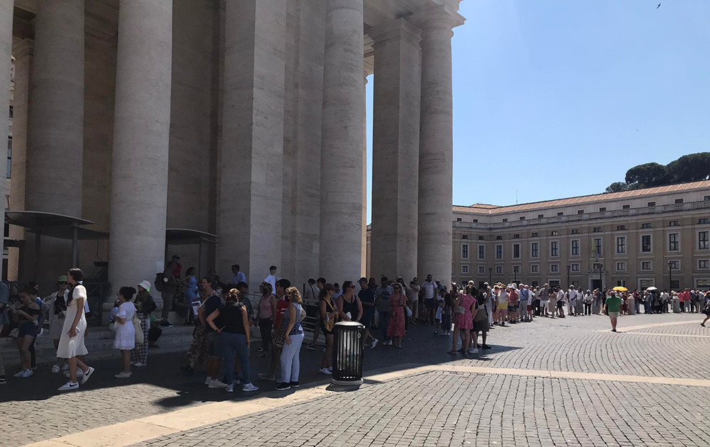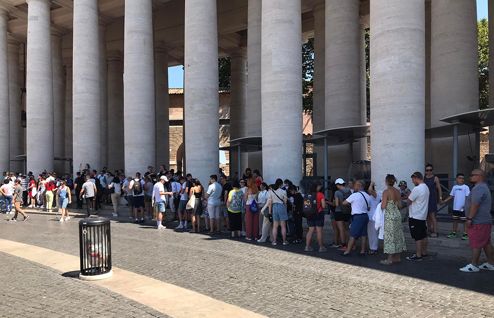 Du khách xếp hàng dài dưới cái nắng 38 độ để vào tham quan Vatican hôm 18/7, trùng với thời điểm châu Âu đang đối mặt với làn sóng nhiệt thứ hai trong mùa hè này. Ảnh: Lý Dật Thụ