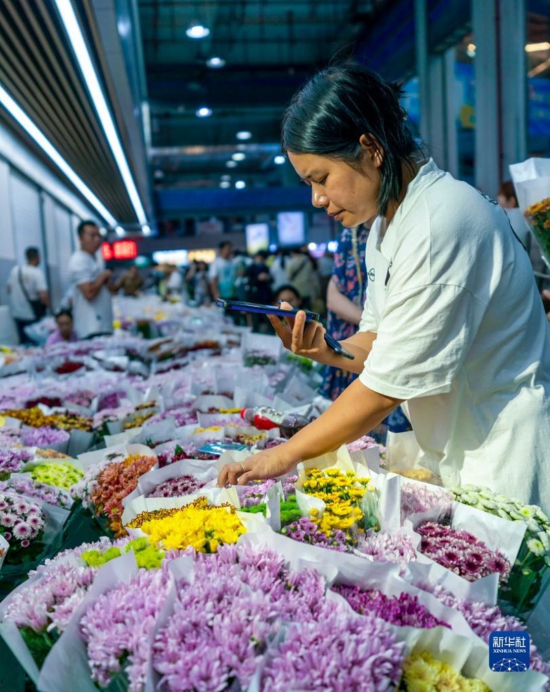 Khung cảnh chợ hoa Đẩu Nam ngoài trời vào tối ngày 12/7.