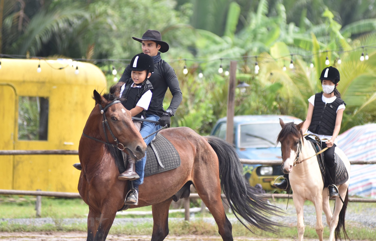 Các "học viên nhí" sẽ được hướng dẫn những kỹ thuật cưỡi ngựa bài bản bởi các huấn luyện viên chuyên nghiệp. (Ảnh: vietgangz) Sau khi đã làm quen với ngựa, du khách sẽ được học kỹ thuật cưỡi ngựa với các huấn luyện viên chuyên nghiệp. Đội ngũ huấn luyện viên ở Vietgangz đều là những giáo viên có bằng cấp và nhiều năm kinh nghiệm về cưỡi ngựa ở các nước như Thổ Nhĩ Kỳ, Phần Lan, Anh, Nam Phi... và các tay đua chuyên nghiệp đến từ trường đua Đại Nam và Phú Thọ. Bên cạnh đó, những bác sỹ thú y có kinh nghiệm lâu năm trong việc chăm sóc và nuôi dưỡng ngựa cũng sẵn sàng phục vụ nhu cầu của khách hàng.