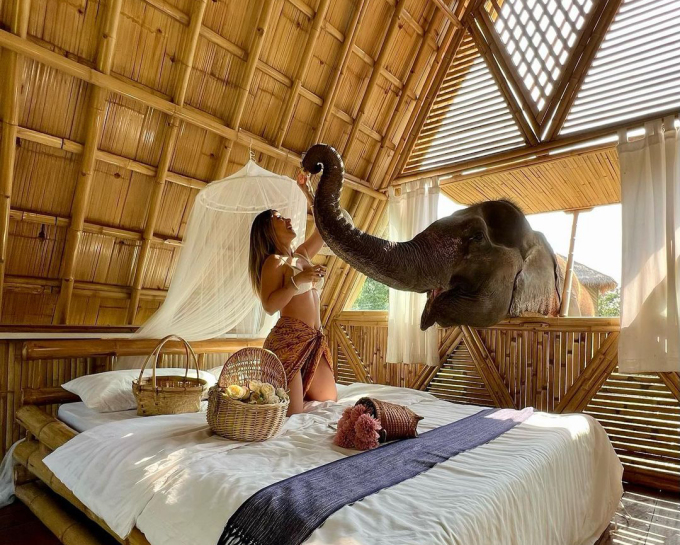 Du khách cho voi ăn từ trong phòng. Ảnh: @carolgiraldo/Instagram Khu nghỉ dưỡng cũng có một nơi chụp ảnh riêng, nơi du khách thường tới để chụp ảnh giao lưu với voi. Tại đây, nhân viên khu nghỉ sẽ gợi ý cách lựa chọn một giỏ trái cây phù hợp để cho voi ăn nhẹ nhàng vào buổi chiều.