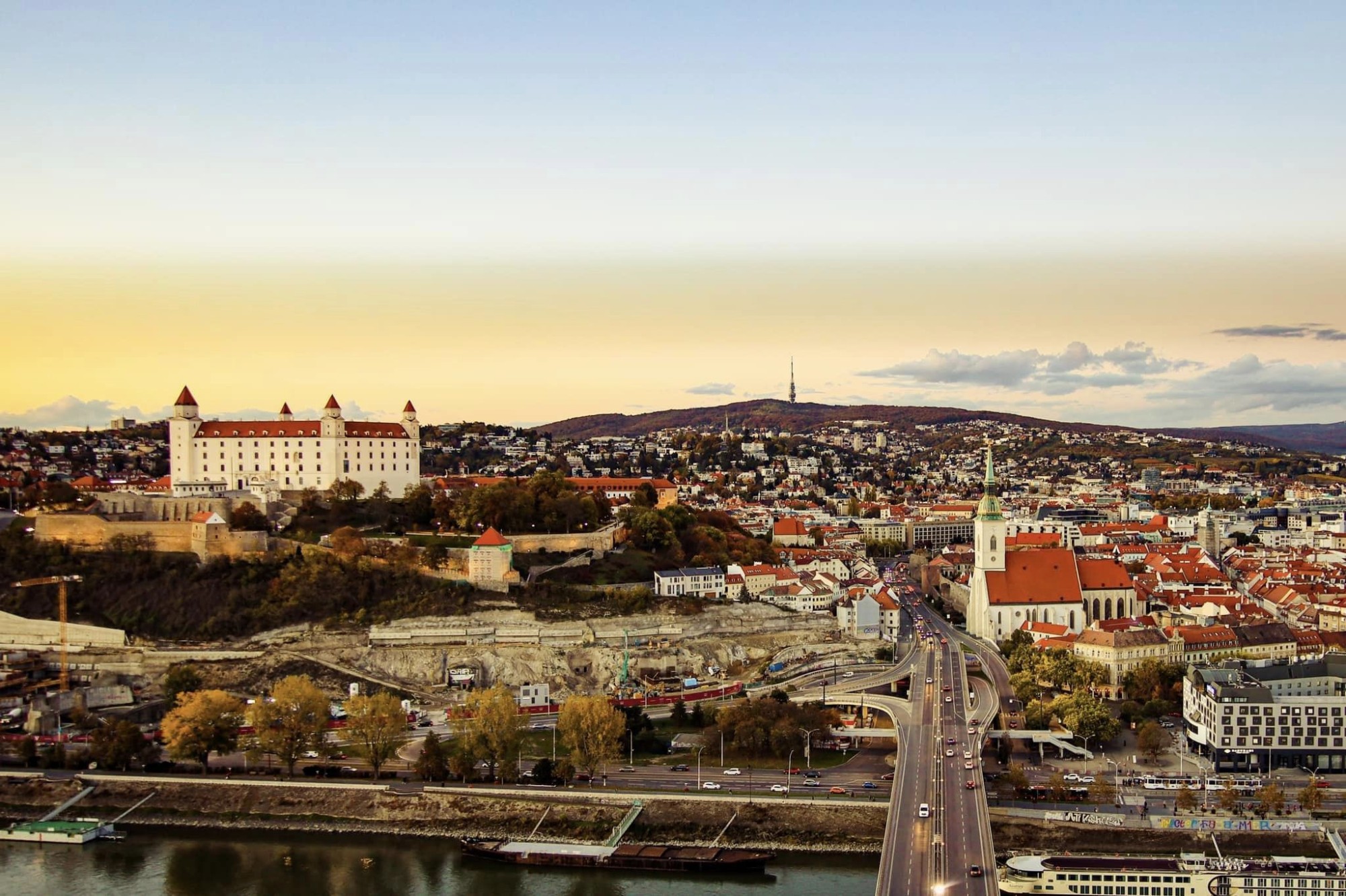 Nằm trải dài bên dòng sông Danube, thủ đô Bratislava của Slovakia mang vẻ đẹp yên bình, thơ mộng, còn lưu giữ nhiều công trình kiến trúc lâu đời vô cùng đẹp mắt. Từ điểm ngắm cảnh trên cây cầu Most SNP (UFO) - cây cầu đường bộ bắc qua sông Danube, cầu dây văng một trụ dài nhất thế giới, du khách có thể chiêm ngưỡng phía tây thành phố, nơi có tòa lâu đài Bratislava uy nghi với 4 ngọn tháp sừng sững qua năm tháng.
