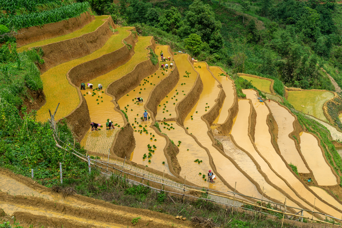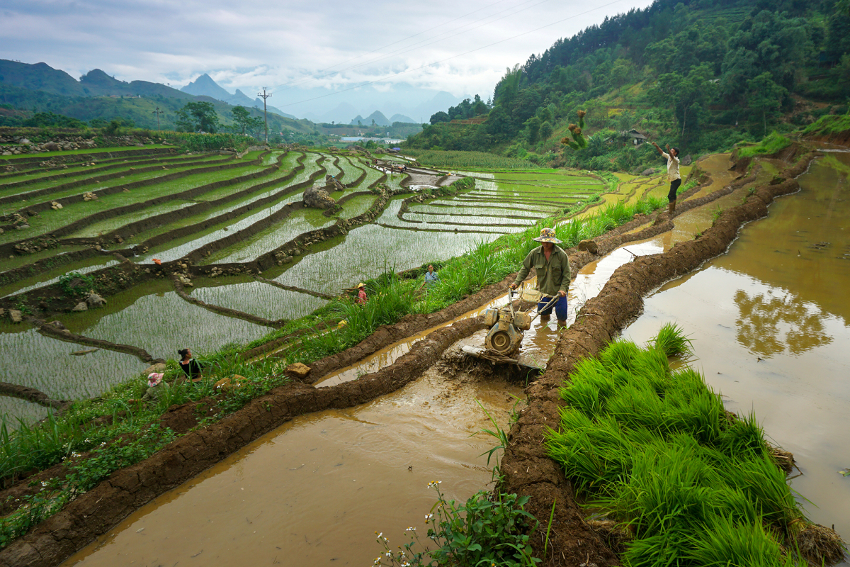 Trước đây người dân chỉ cấy một vụ nhưng nay là hai, với sự đầu tư kênh mương thủy lợi. Họ tháo nước từ trên xe núi vào ngâm đất. Qua những ống nứa, nước tràn xâm xấp mặt ruộng. Ruộng bậc thang phía dưới rộng lớn, càng lên dốc cao thì càng nhỏ lại. Thửa ruộng nào gần đường hoặc đồi dốc, người dân sẽ dùng xe cơ giới hỗ trợ nếu đi lại thuận tiện.