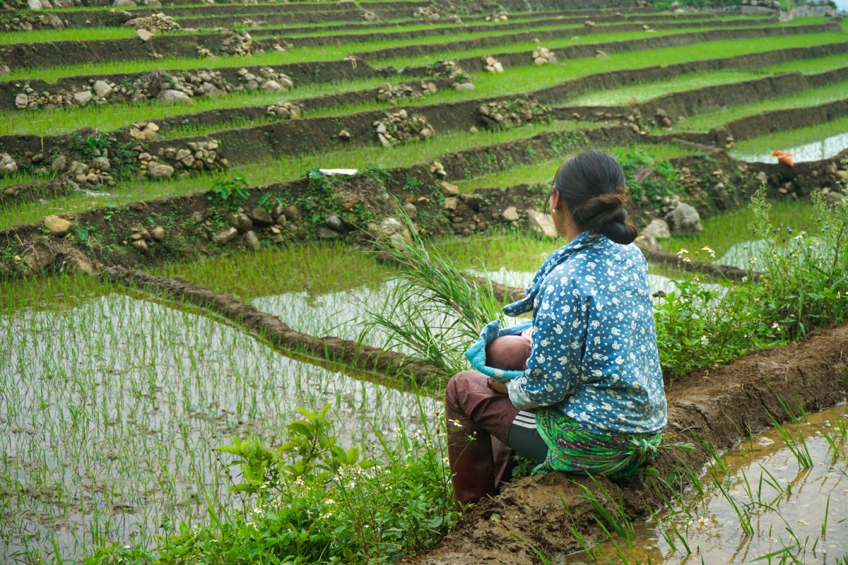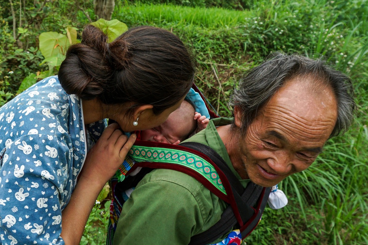 Một người mẹ đang cấy bỏ dở khi thấy con được địu ra ruộng. Ở đây, chỉ những đứa trẻ nhỏ vài tháng tuổi mới được gửi ở nhà với ông bà, cụ. Nếu không có ai trông giúp, chúng sẽ nằm bên nương và được che chắn lại để ngủ.