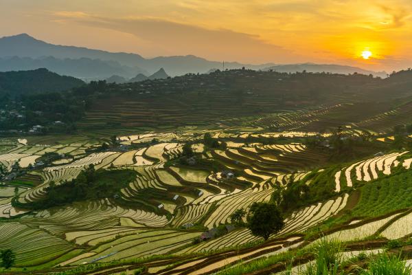 Những vệt nắng cuối ngày nhuộm sắc vàng cho ruộng bậc thang mùa nước đổ. Phía xa là nếp nhà của người dân tộc Mông, tô điểm cho vẻ đẹp yên bình nơi rẻo cao Tây Bắc.