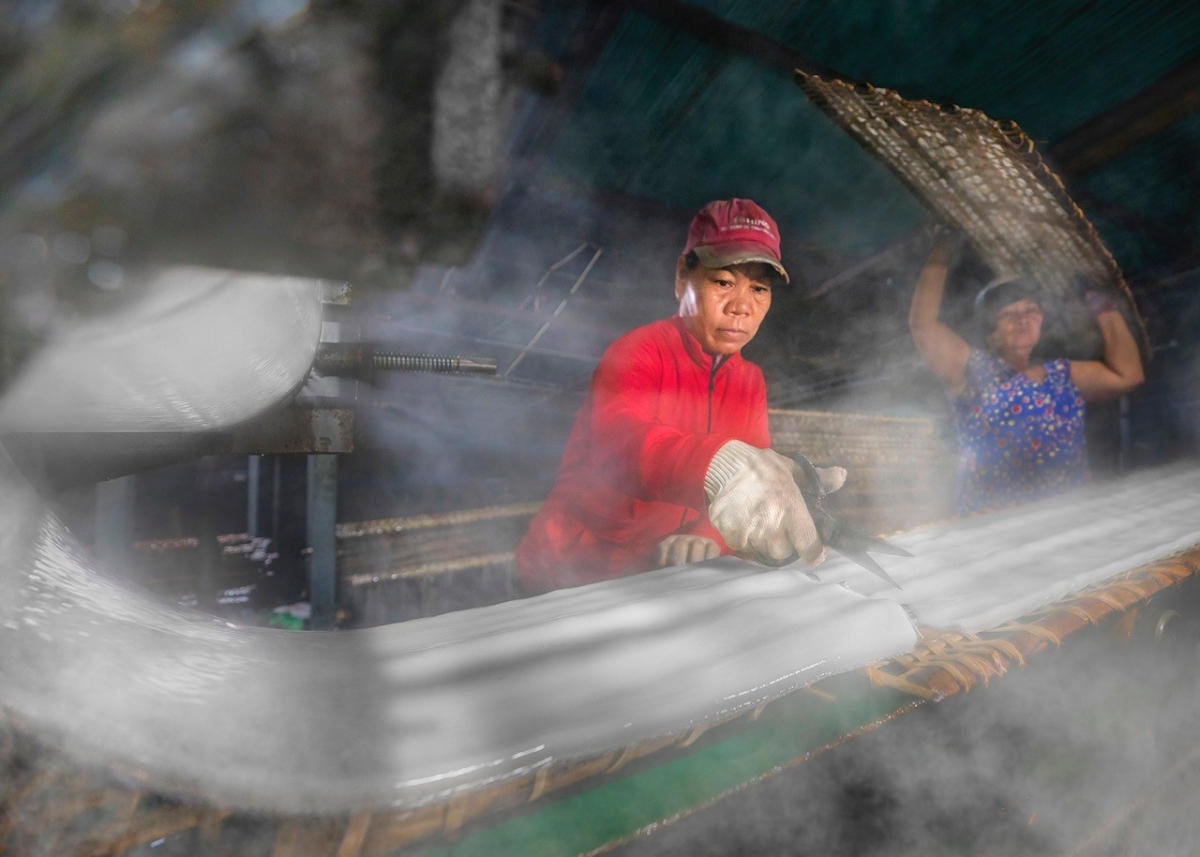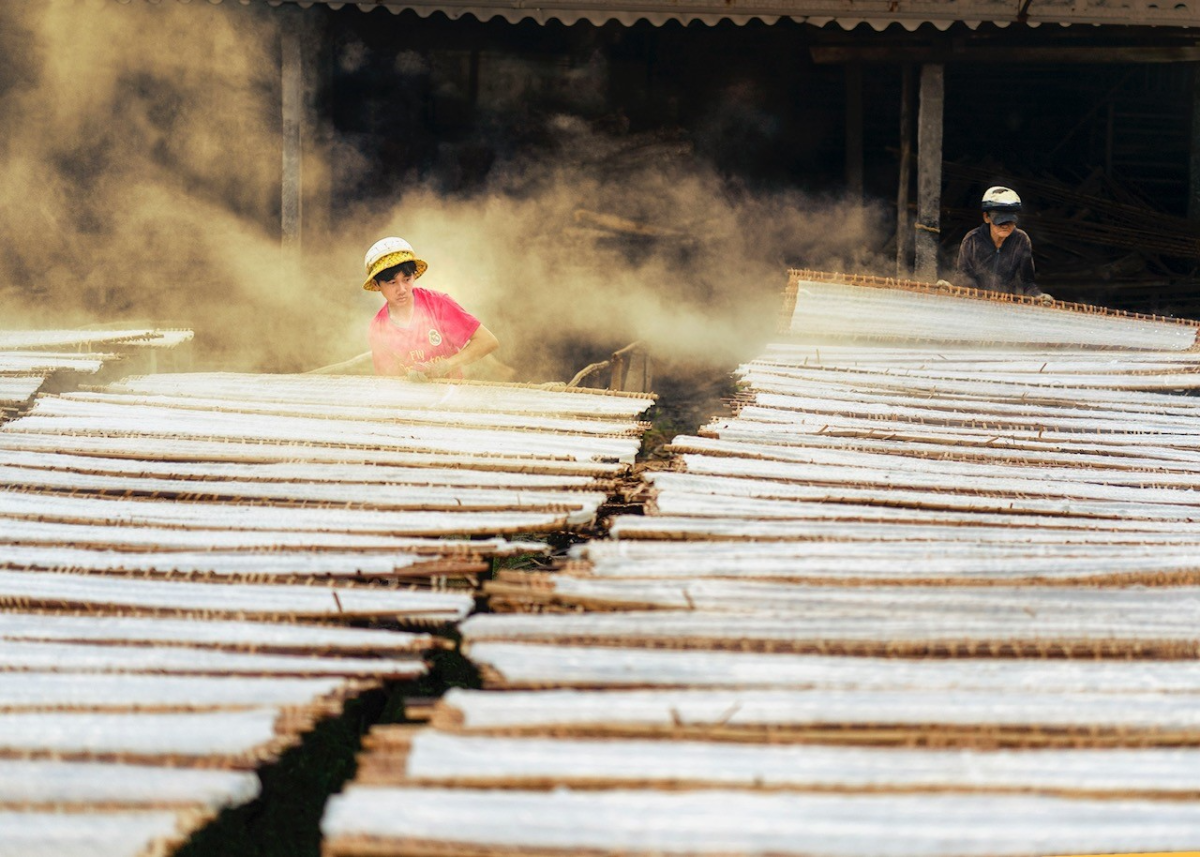 Bức ảnh thuộc bộ ảnh “Bột khoai, đặc sản ẩm thực truyền thống của Tây Ninh” của nhiếp ảnh trẻ Huỳnh Thanh Liêm (32 tuổi) thực hiện tại ba hộ gia đình ở xã Long Thành Nam, thị xã Hòa Thành. Những máy hấp cho ra những mẻ bột khoai bốc khói. Bánh đặt trên giàn tre và được người thợ đội mũ bảo hộ đặt giàn tre trên đầu đem phơi.