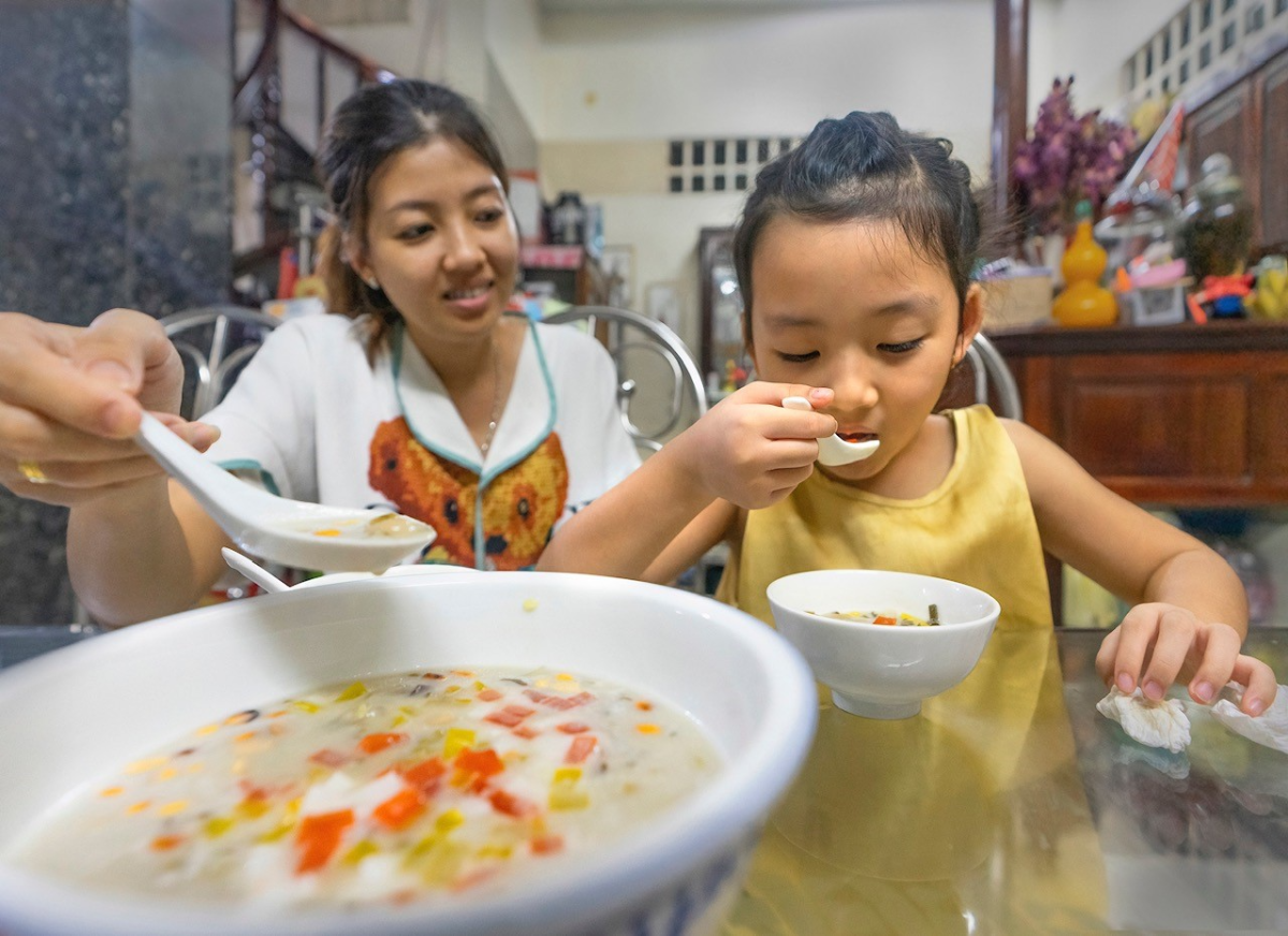 Bé Thanh Vân, 5 tuổi, thưởng thức món chè làm từ bột khoai do ba mẹ mua về nấu.