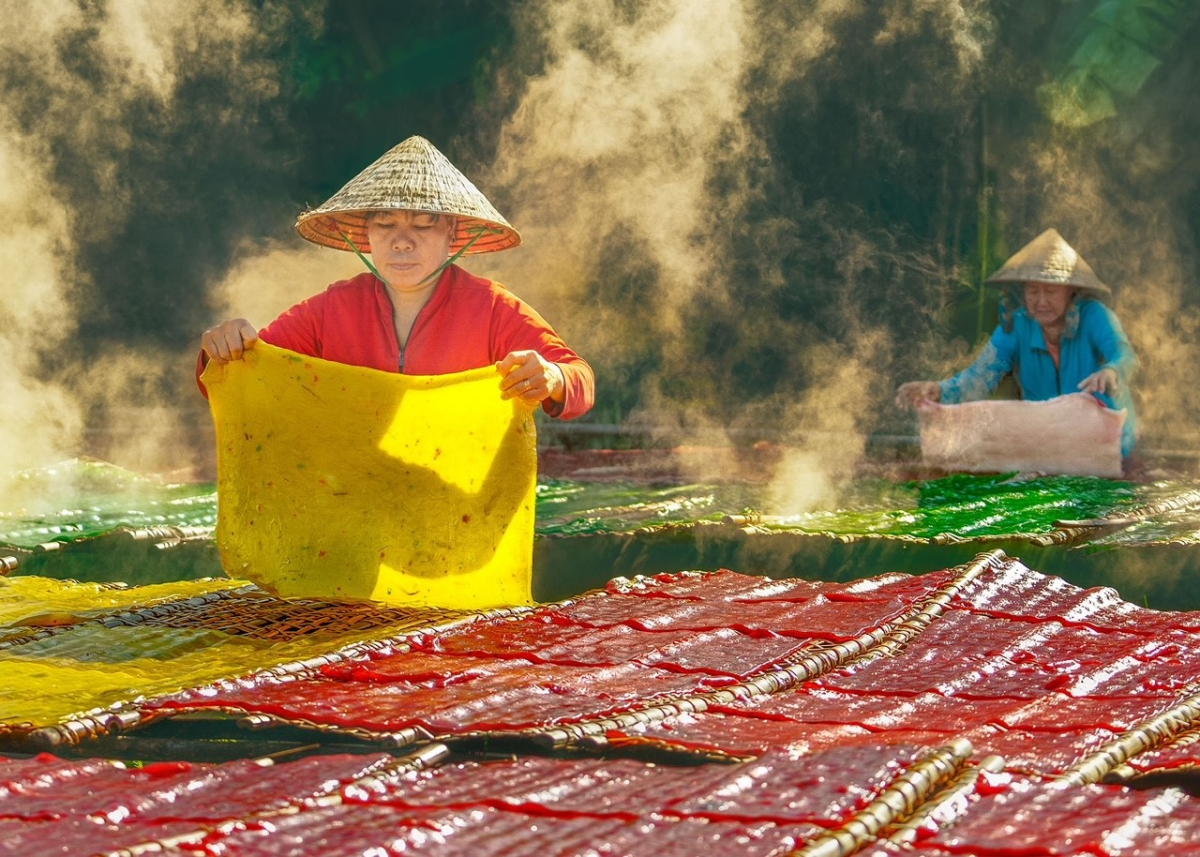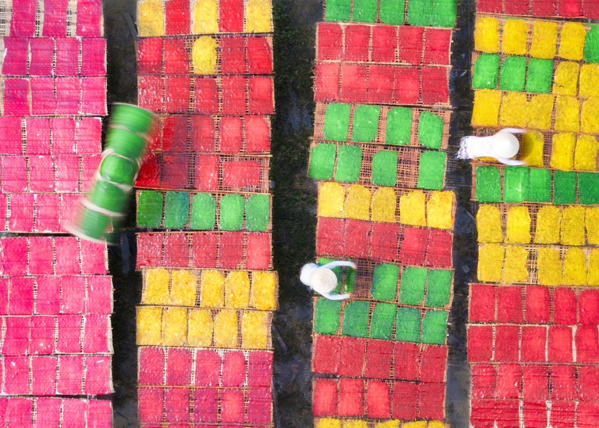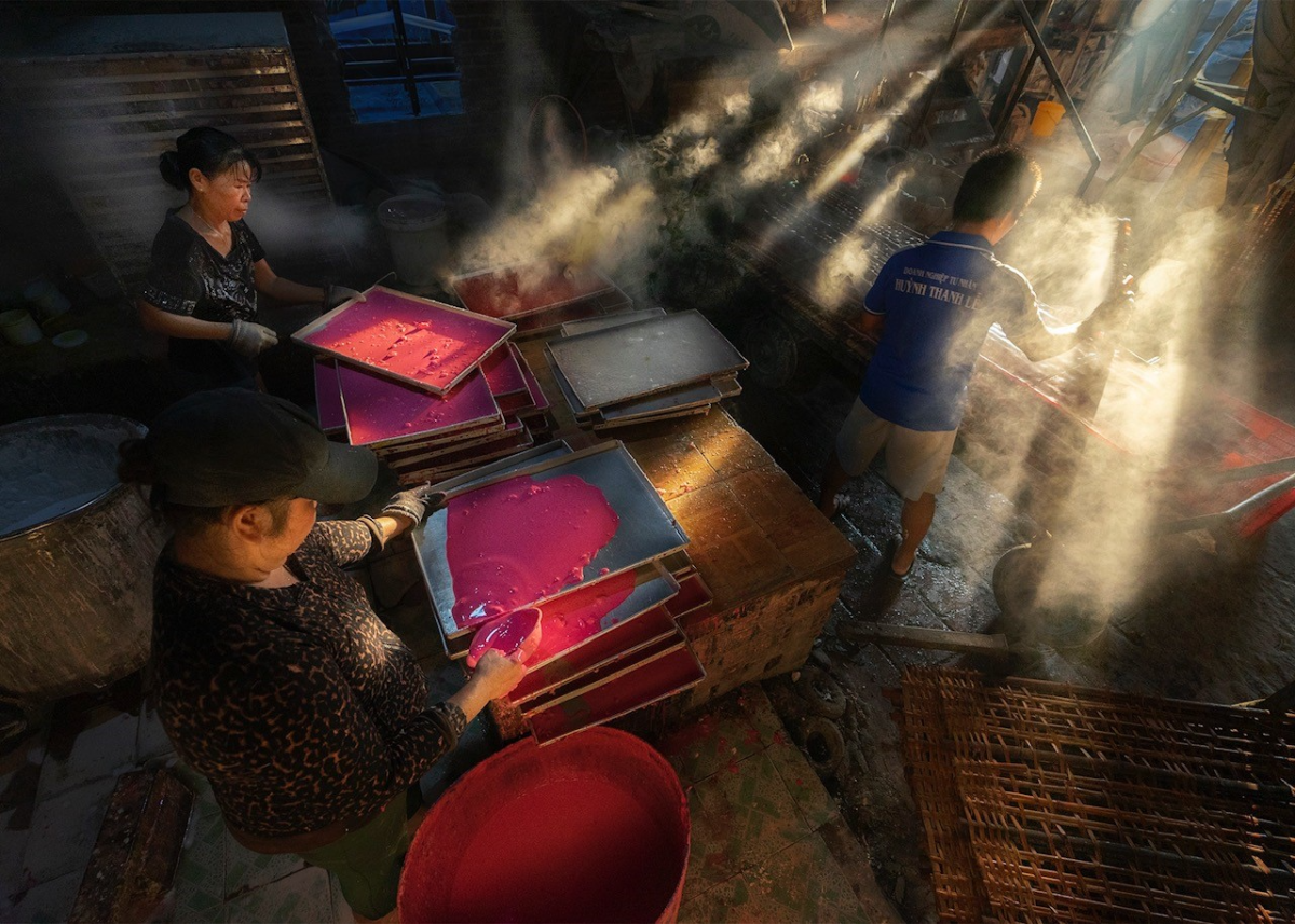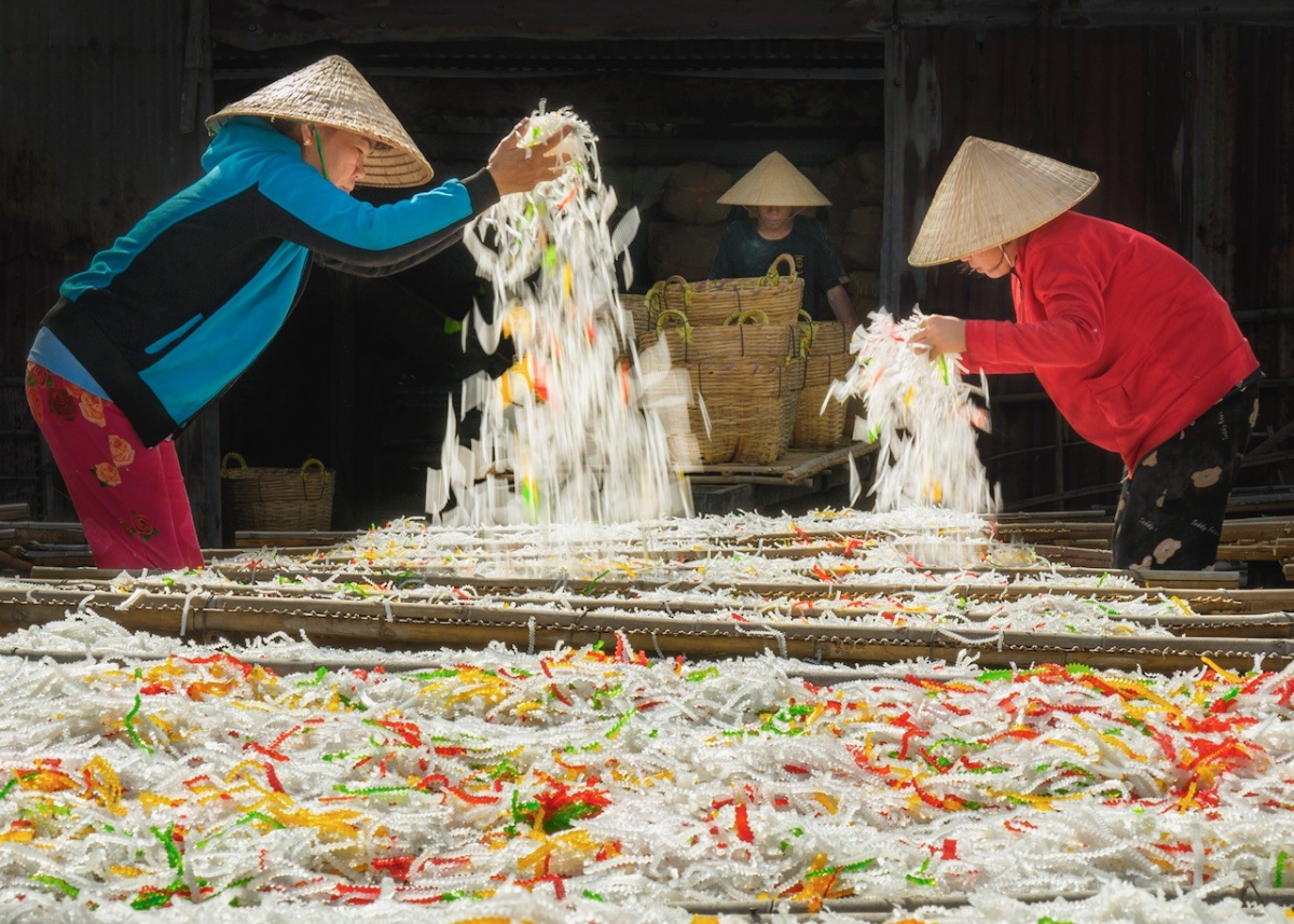Công đoạn trở bánh khi phơi được nhiếp ảnh gia ghi lại là điểm nhấn sắc màu rực rỡ cho bộ ảnh làng nghề.