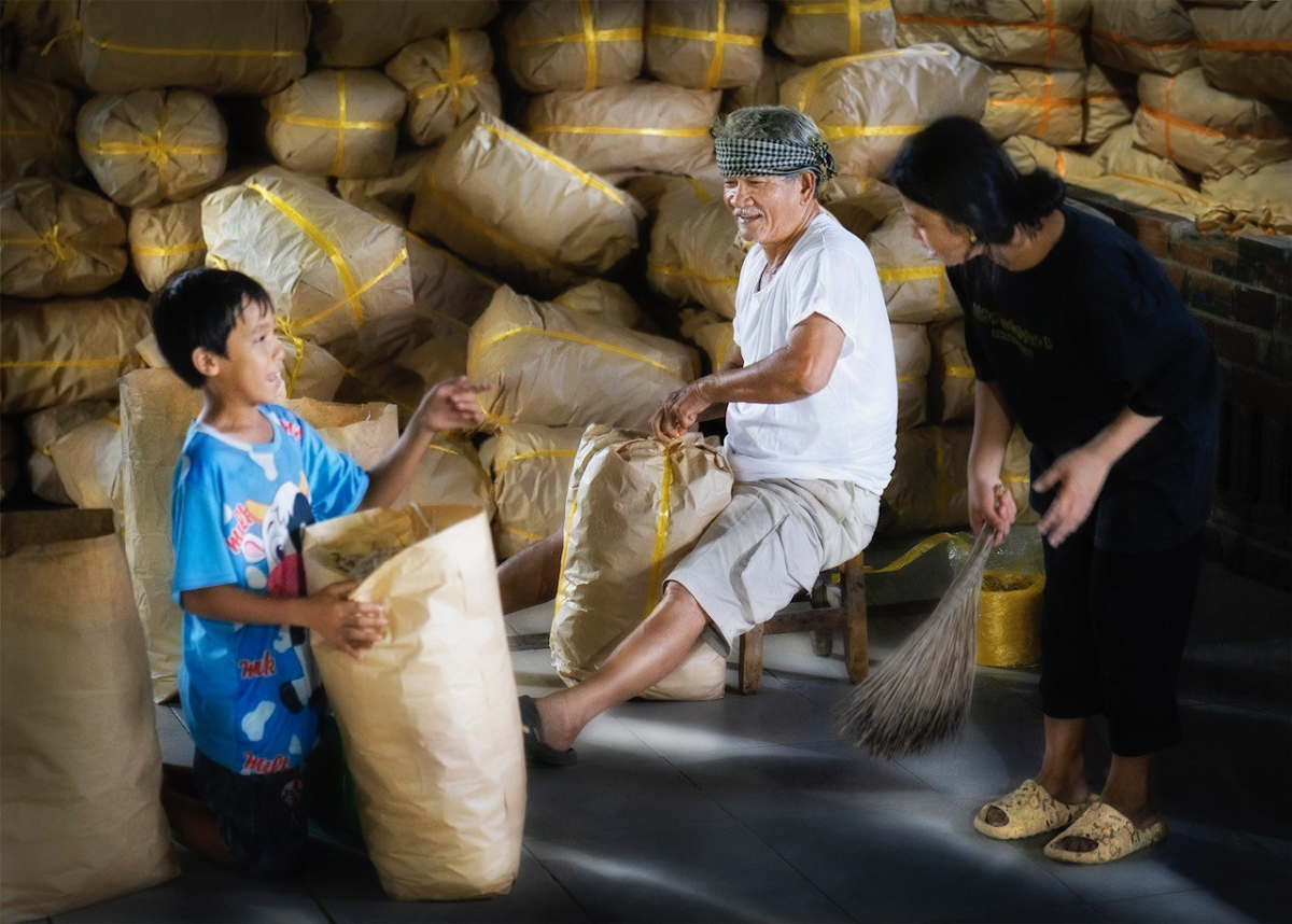 Ông Tư, một người dân trong xã, đang đóng gói thành phẩm cùng các cháu.