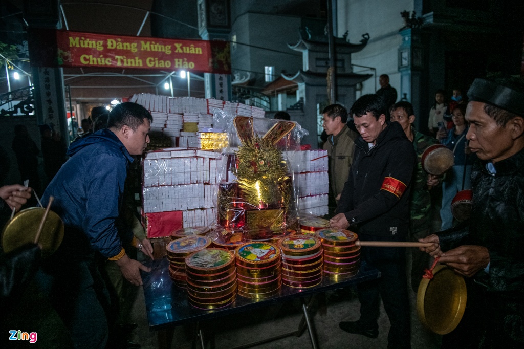 Đúng 21h, các vị cao niên đánh chiêng từ trong hậu cung, đưa vàng mã ra sân chuẩn bị hóa và chia lửa cho dân làng.