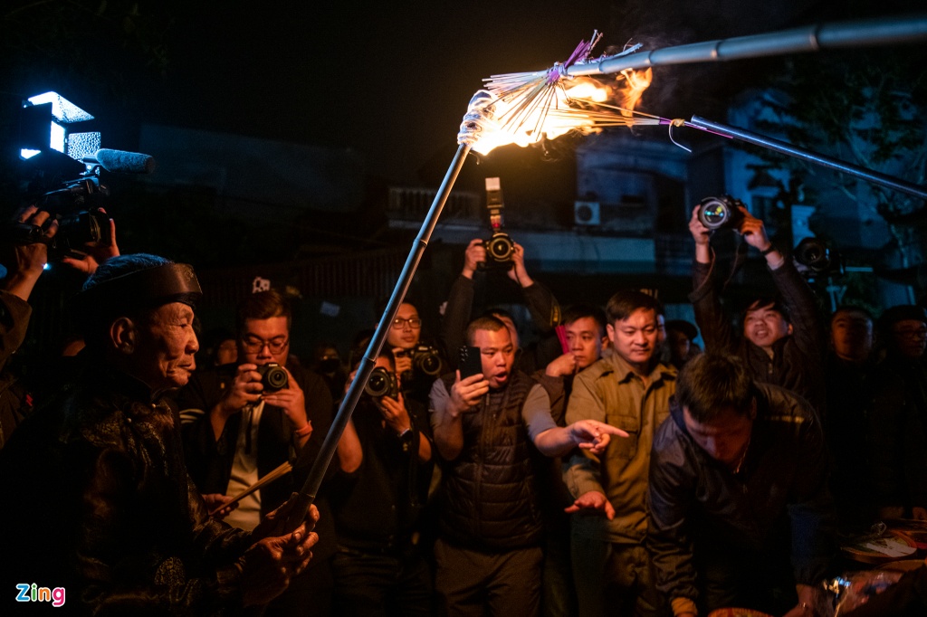 Vị cao niên đưa lửa từ trong đình ra sân bằng một cây gậy dài. Đối với người dân An Định, nghi lễ "lấy đỏ" mang ý nghĩa thiêng liêng và may mắn.