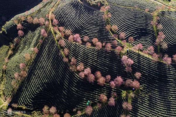 Trong tiết trời lạnh cuối năm, hoa mai anh đào nở rộ tạo nên sắc hồng nổi bật giữa màu xanh của những đồi chè và núi, rừng vùng cao.