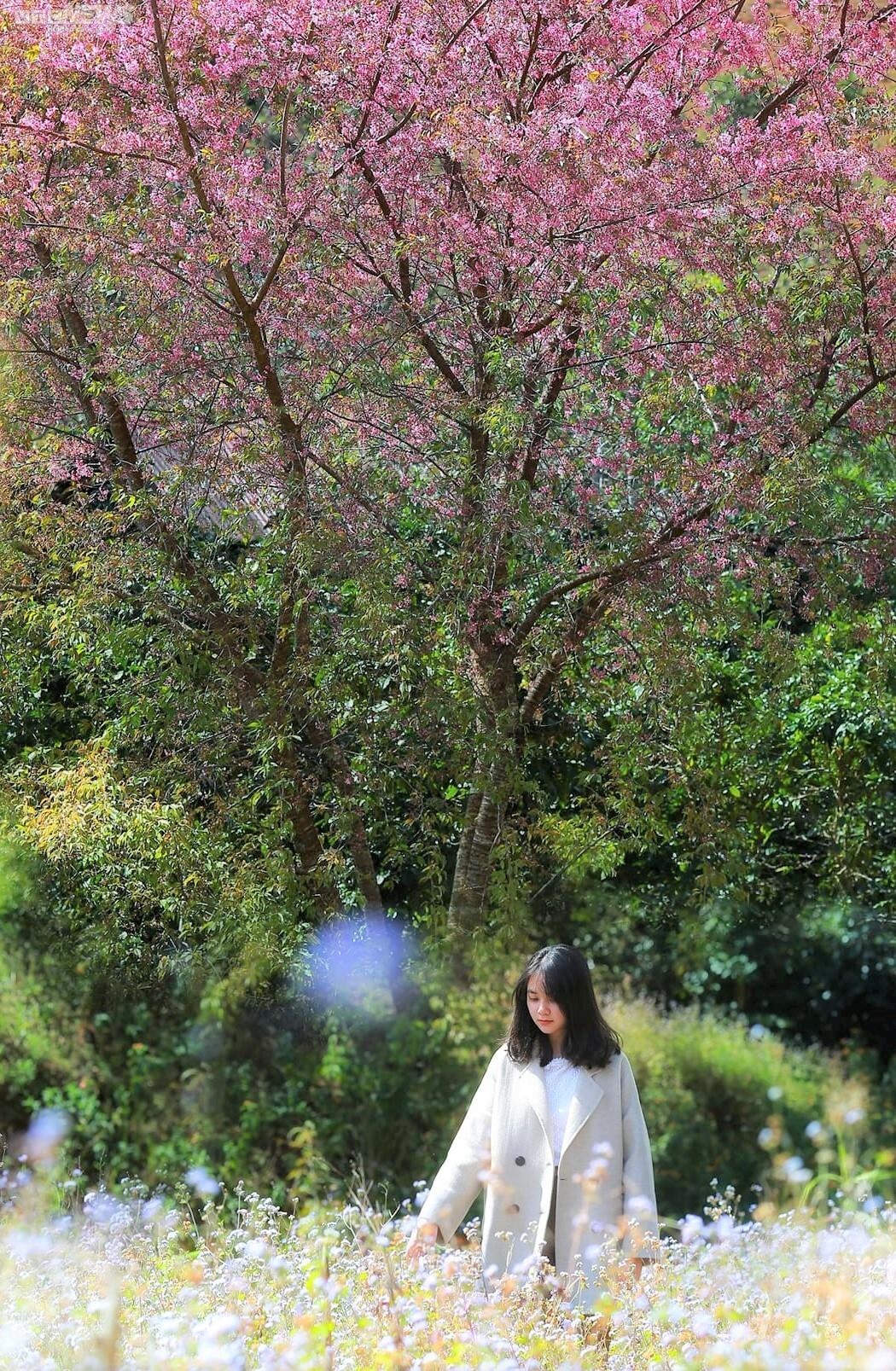 Thiếu nữ check-in dưới tán cây mai anh đào.