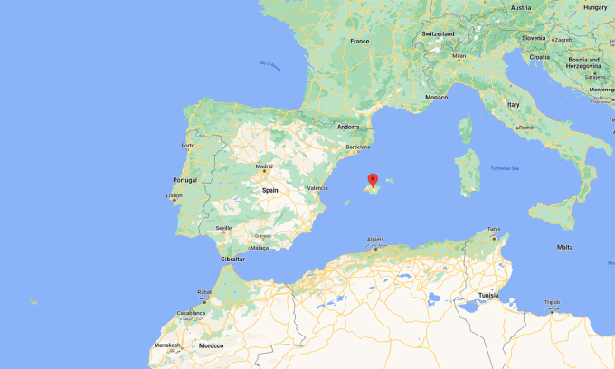 Vị trí đảo Mallorca (đánh dấu đỏ). Đồ họa: Google.Phần lớn diện tích bờ biển phía đông của Mallorca là các khu nghỉ dưỡng lớn. Thủ phủ Palma, thành phố lớn nhất trên đảo, có các công trình kiến trúc nổi tiếng như nhà thờ Santa Maria de la Palma với kiến trúc Gothic thế kỷ 13, pháo đài Almudaina và lâu đài Bellver.