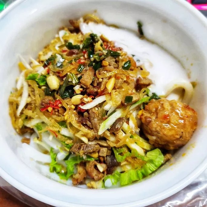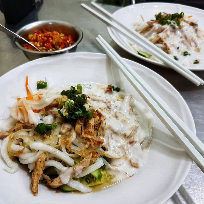 Món bánh tằm bìCô chủ quán bày bánh tằm bì ra đĩa với chút dưa chuột, rau thơm, giá ở phía dưới và rưới nước cốt dừa béo ngậy lên trên cùng nước mắm được chế từ chanh, tỏi, ớt.