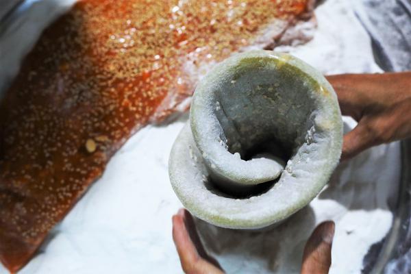 Công đoạn khuấy bột chè lam quyết định độ mềm, dẻo của món ăn. Ảnh: Ngọc Thành Theo cách truyền thống, cho mật mía, mạch nha, gừng, nước lọc vào nồi nấu sôi, sau mới thêm bột gạo nếp, lạc rang vào nồi, chú ý đảo đều, liền tay để bột không bị dính và cháy. Nếu cho quá ít bột, chè lam sẽ dính, còn nhiều bột thì bánh nhanh cứng nên người làm phải canh hỗn hợp đặc, dẻo thì ngưng để bánh có độ mềm khi ăn.