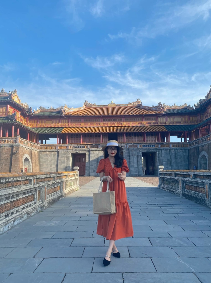 Thảo chụp ảnh trước kinh thành Huế từ sớm, lúc này ít du khách.Thảo cho biết, lịch trình 2 ngày một đêm phù hợp với cô, vừa có nhiều ảnh đẹp mà vừa ăn được nhiều đồ ngon. Với lịch trình này, cô đi hết các điểm và rảnh từ chiều ngày thứ hai để có thể nghỉ ngơi, tránh nóng. Nếu ai muốn khám phá thêm biển, Thảo khuyên nên đi 3 ngày 2 đêm.