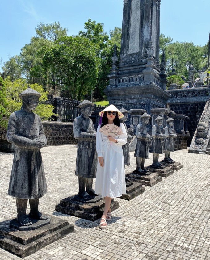 Thảo chụp ảnh trong lăng Khải Định. Về kinh nghiệm độc hành, đặc biệt với con gái, Thảo chia sẻ "nên biết nói dối một tí". "Cả chuyến đi ai cũng hỏi mình là sao lại đi một mình, đi một mình buồn lắm, bạn bè đâu hết rồi? Mỗi lần ai hỏi như thế, mình sẽ nói là vào nhà người thân chơi rồi tiện đi tham quan chứ không nói đi một mình, như vậy cảm giác an toàn hơn", Thảo nói.