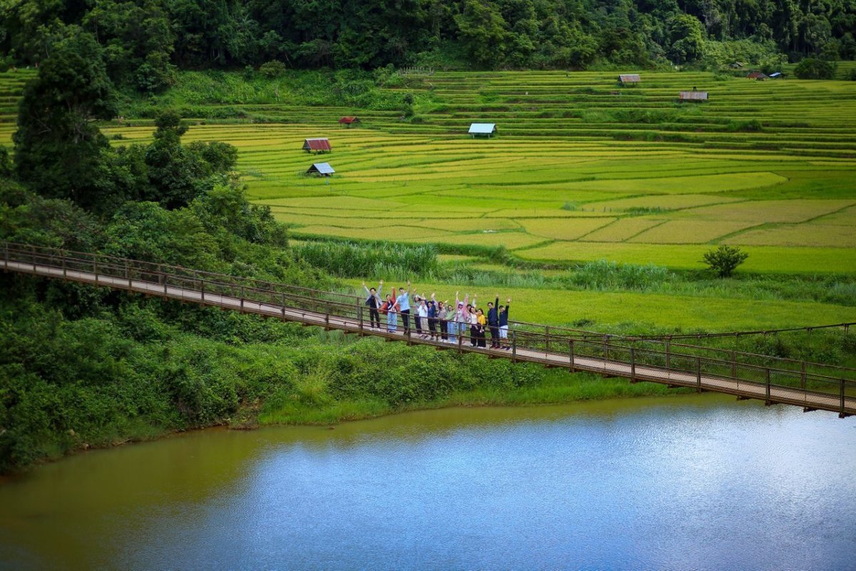 Cầu treo Kon Tu Rằng cách thị trấn Măng Đen 10 km. Cầu bắc qua sông với nhiều bãi đá tự nhiên, lớn nhỏ đan xen. Hai bên dòng sông là đồng lúa tạo thành lớp sóng chạy dài dưới nắng. "Khung cảnh như một bức tranh khổng lồ ngay dưới chân. Không bõ công bọn mình chạy xe hơn 10 km tới đây", Hằng kể.