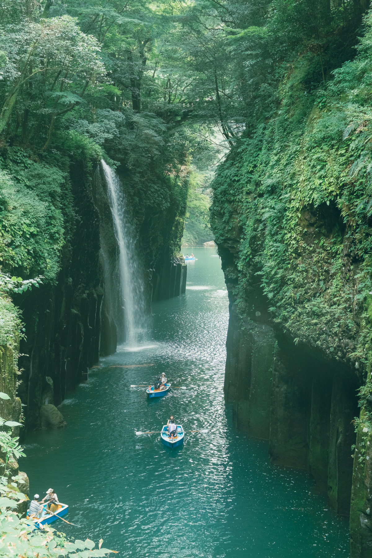 Hẻm núi Takachiho huyền thoại của tỉnh Miyazaki, vùng Kyushu. Nơi này được hình thành sau một trận phun trào núi lửa cách đây khoảng 100.000 năm. Theo truyền thuyết, hẻm núi này là khởi nguồn của nước Nhật. Chèo thuyền qua hẻm núi từ tháng 4 đến tháng 10, du khách tận hưởng không khí mùa hè mát mẻ dưới những tán cây xanh và ngắm thác Minainotaki đổ xuống từ độ cao 17 mét.